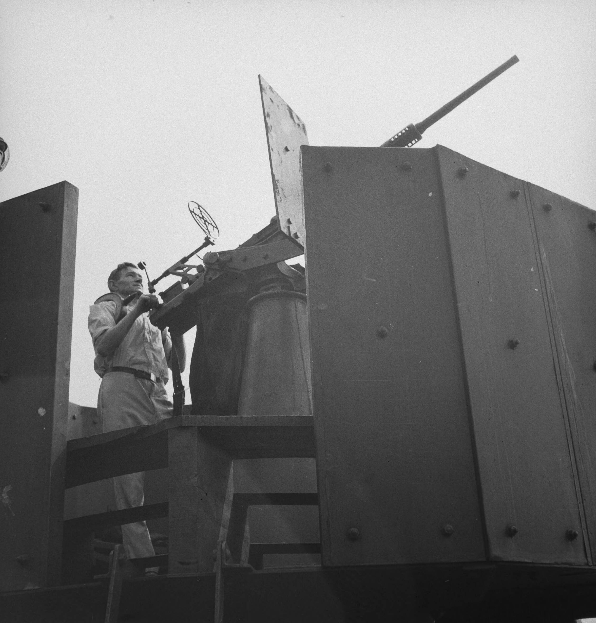 Nederlandse kustvaarder in de Theems. Bemanninsgslid achter luchtafweergeschut