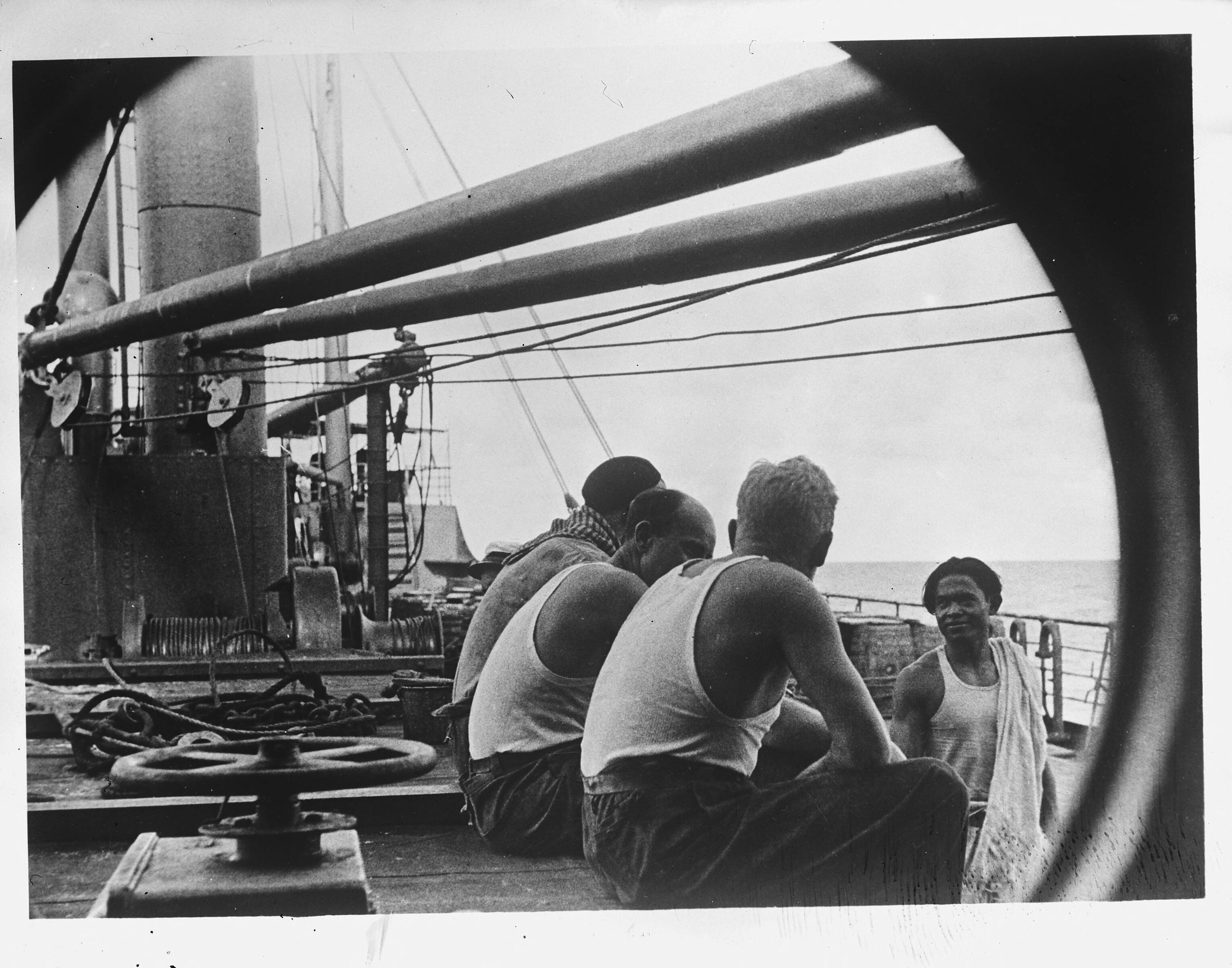 Nederlandse koopvaardij. Zeelieden tijdens een korte pauze op het dek