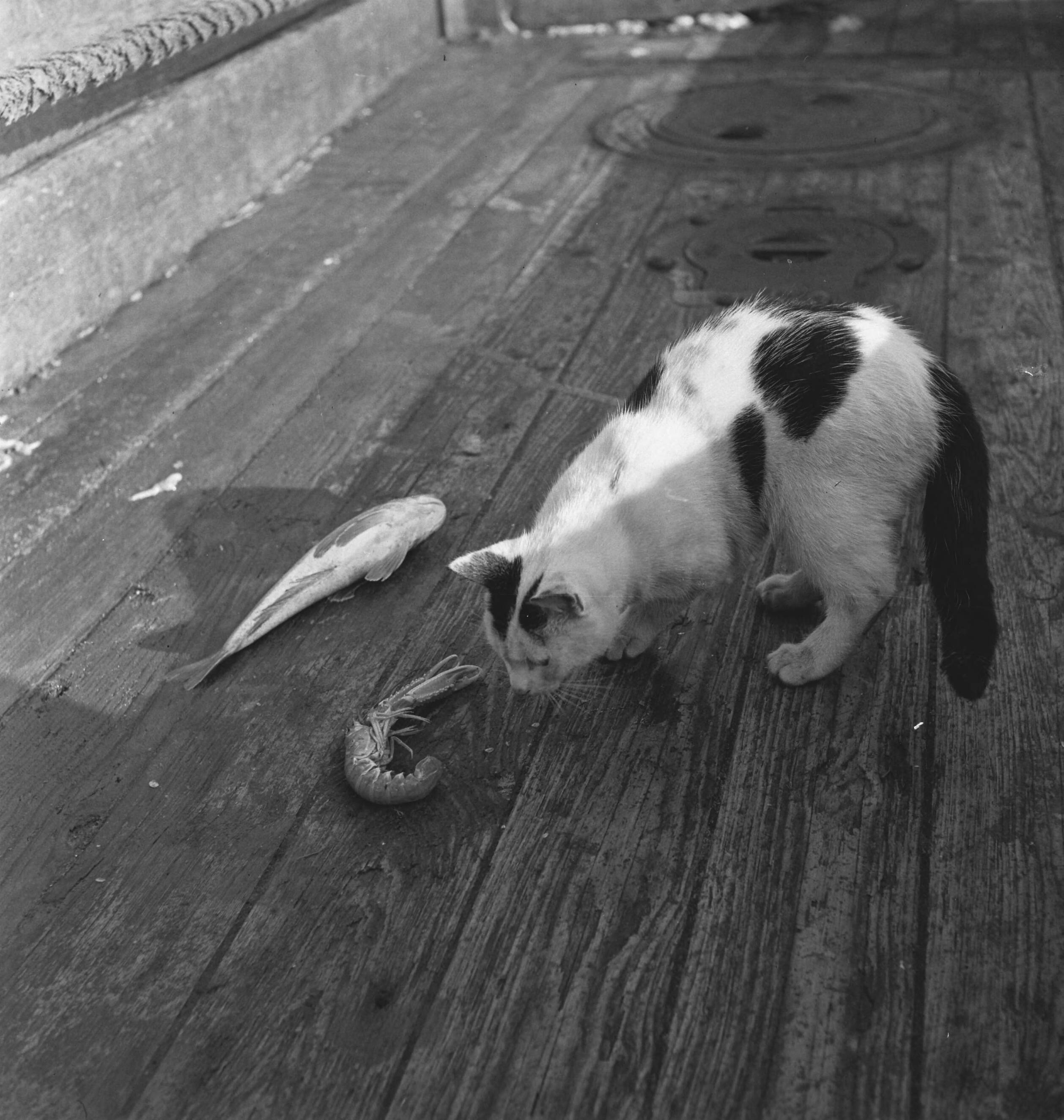 Bijschrift "On board a Dutch trawler" Aan boord van een Nederlandse vistrawler. Scheepskat ruikt aan een langoustine en een vis