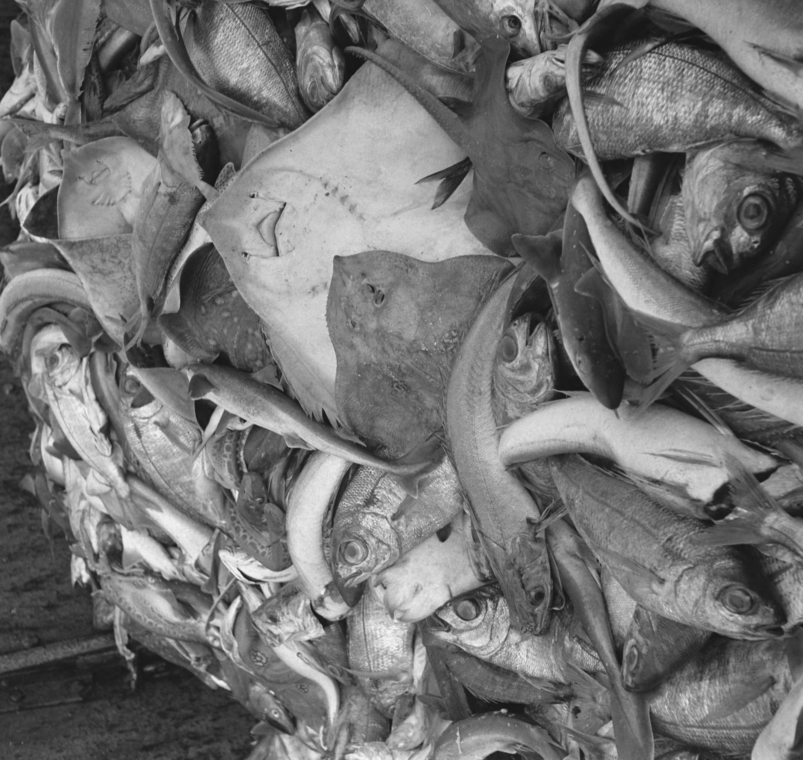 Bijschrift "On board a Dutch trawler" Aan boord van een Nederlandse vistrawler. Gevangen vis van diverse soort