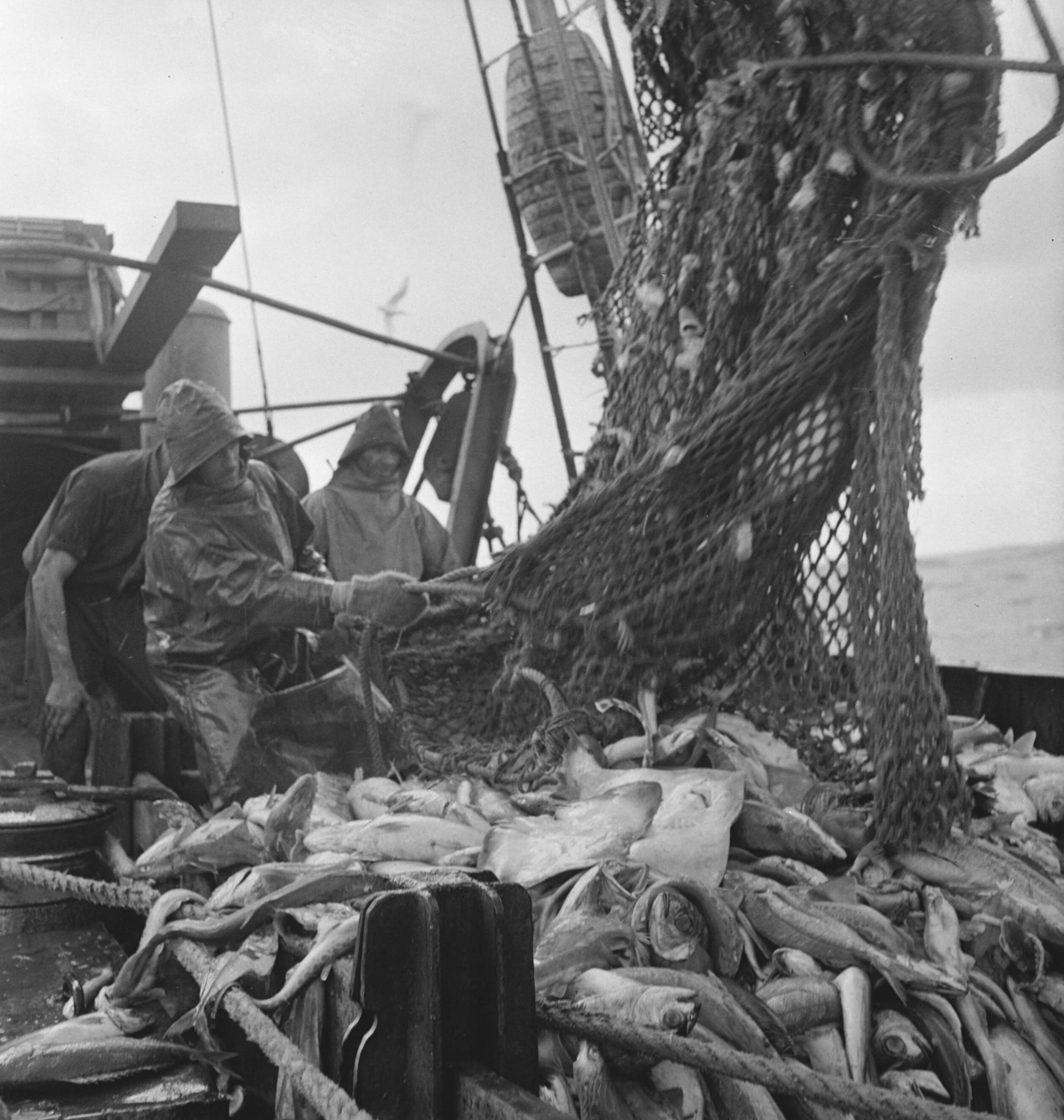 Bijschrift: "On board a Dutch trawler" Aan boord van een Nederlandse vistrawler