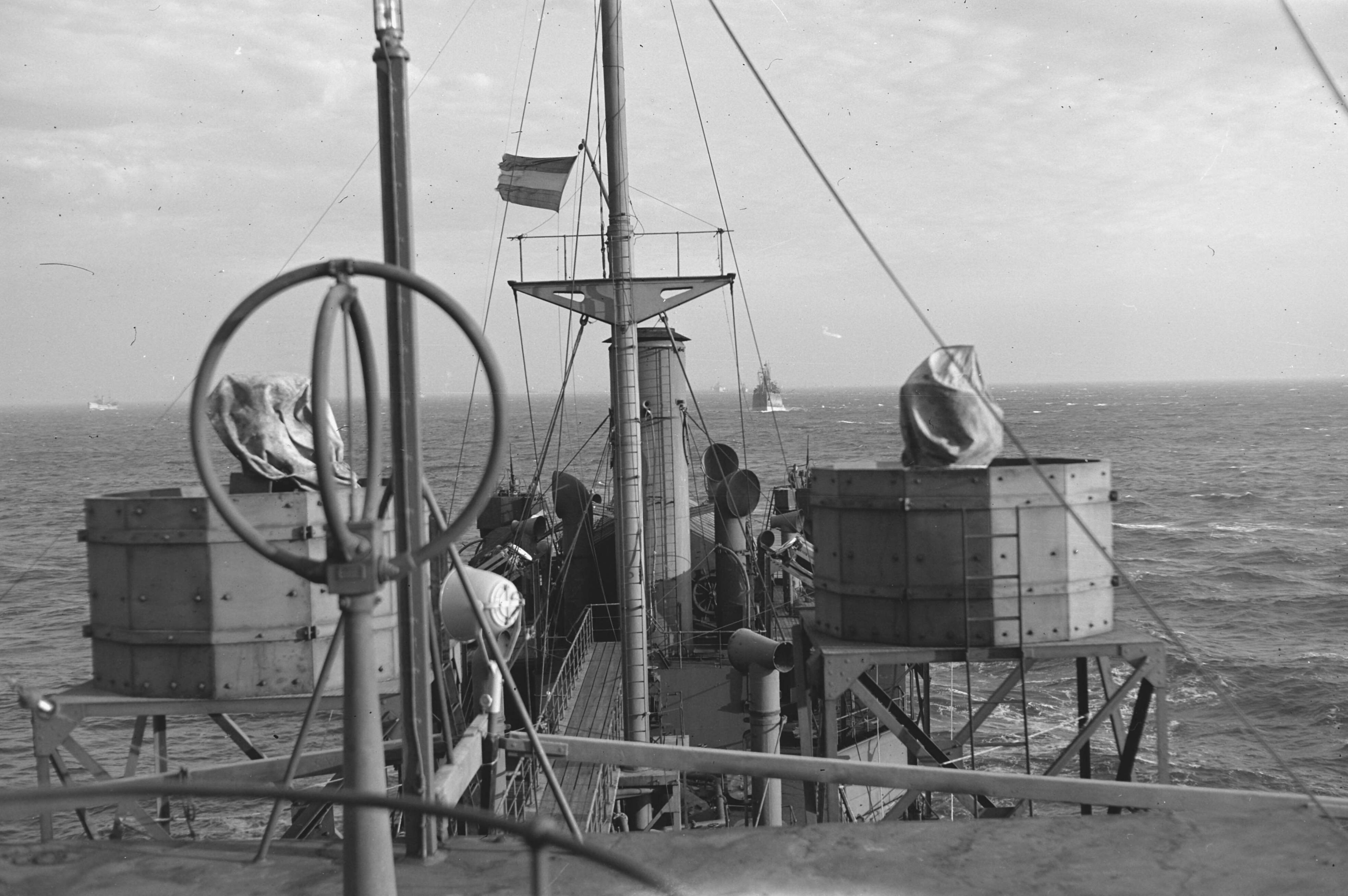 Bijschrift: "On board a Dutch tanker" Aan boord van een Nederlandse tanker