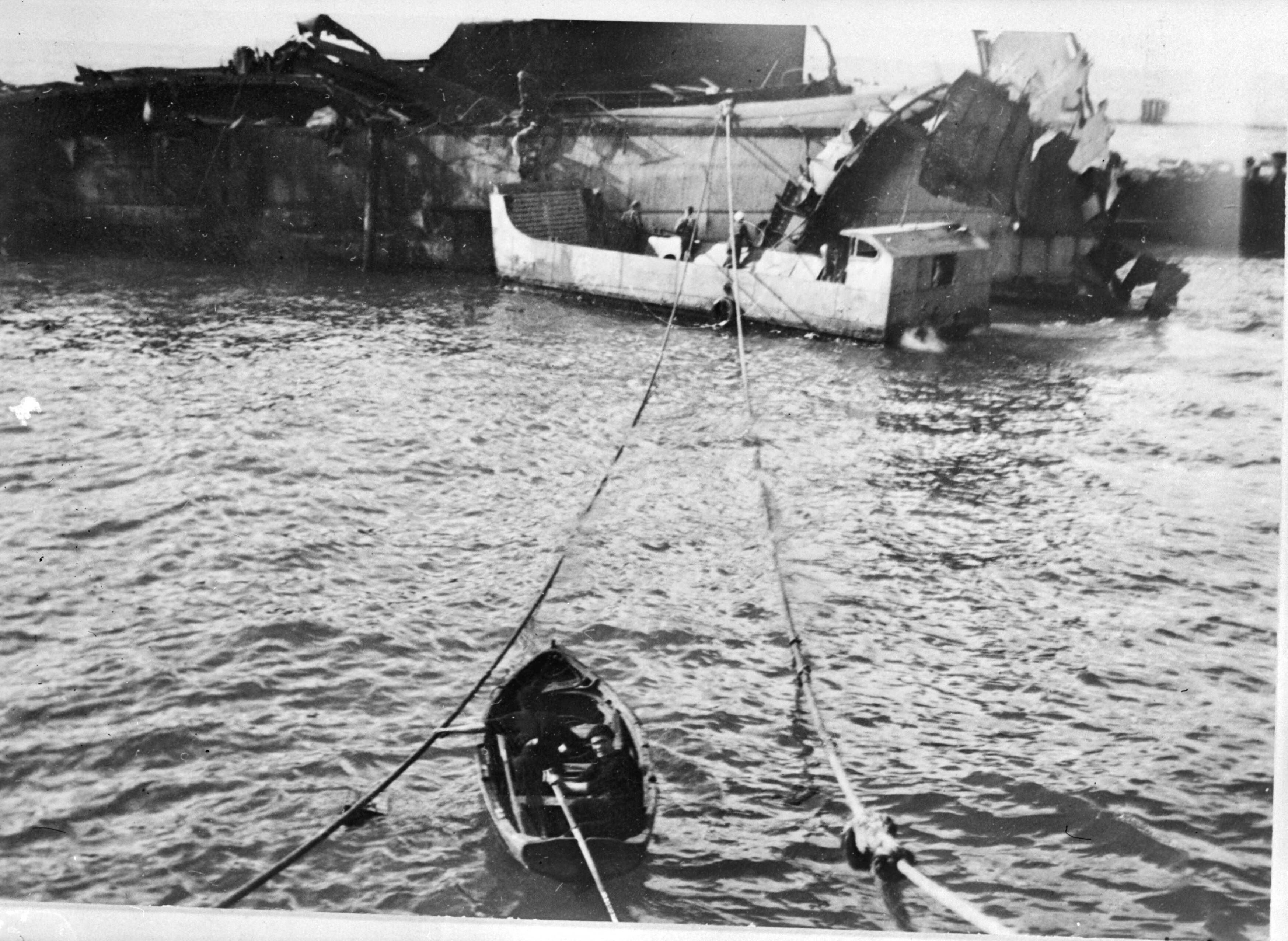 Lijnen zijn gespannen van een wrak van een schip naar een sleepboot? Op de voorgrond een roeiboot. Voor het wrak een veerpont of landingsvaartuig
