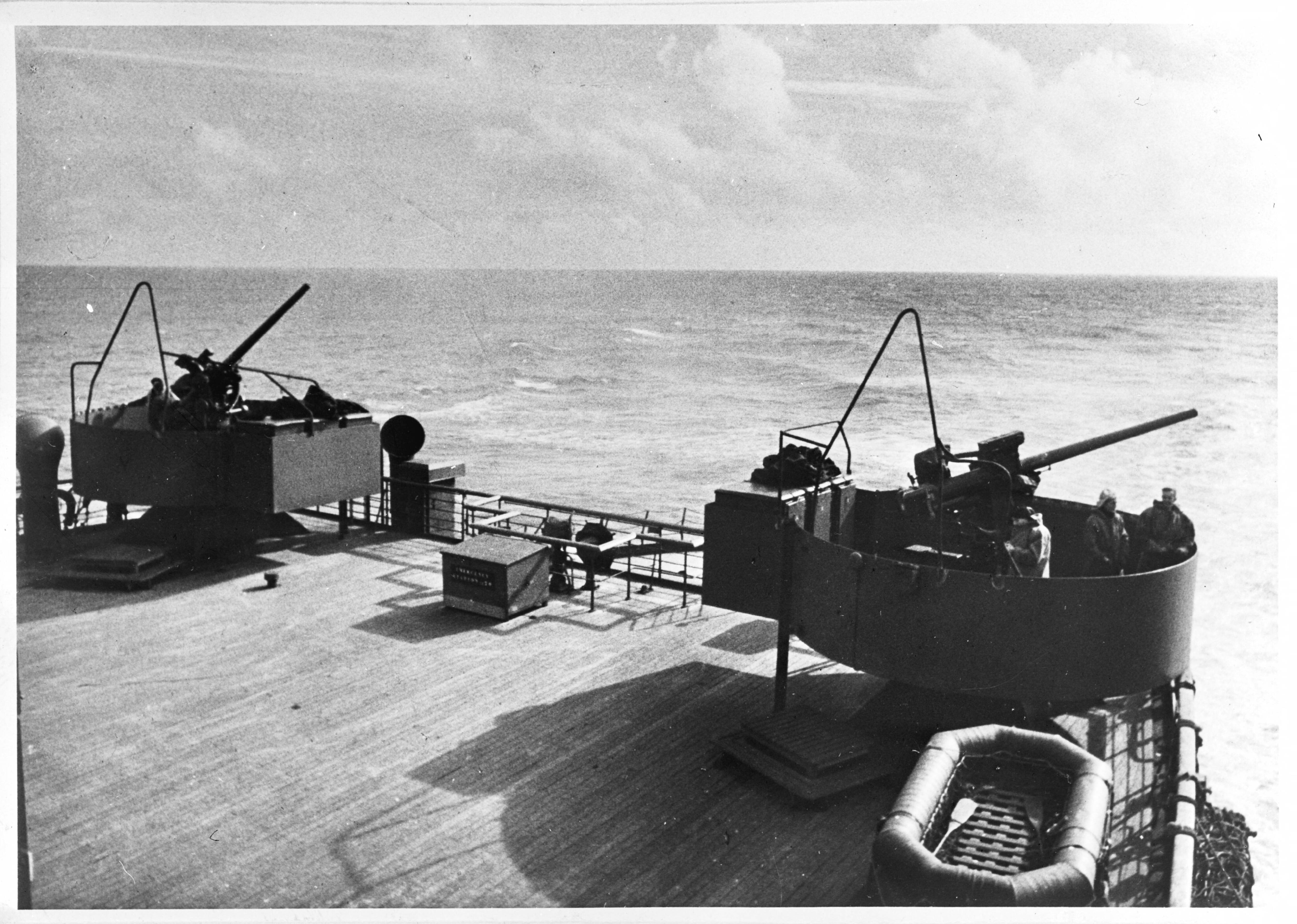 Op een Nederlands passagiersschip in dienst voor troepentransport. Luchtafweergeschut