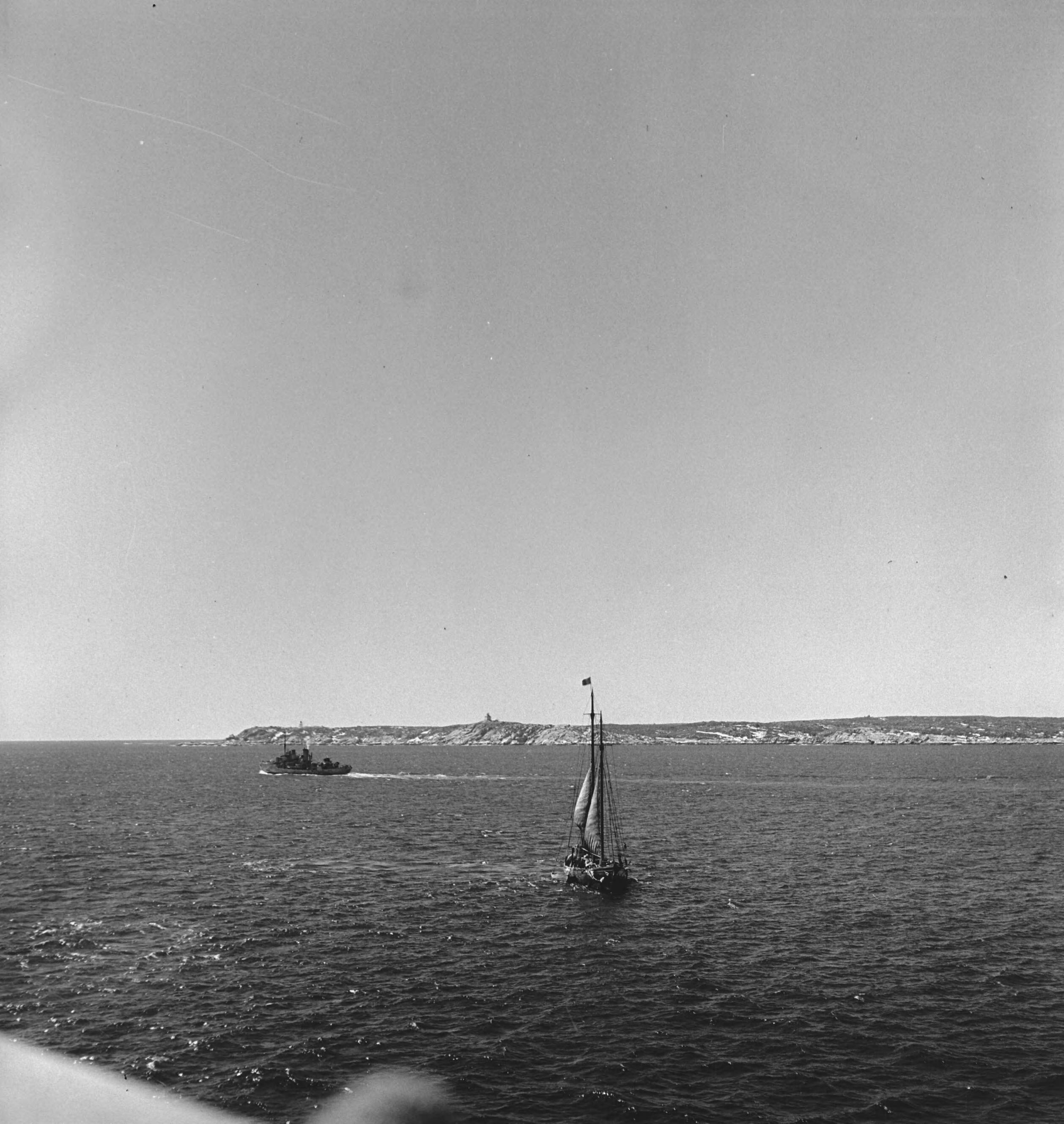 Op een Nederlands passagiersschip in dienst voor troepentransport. Bijschrift: "Pilot's cutter leaving off Canada"