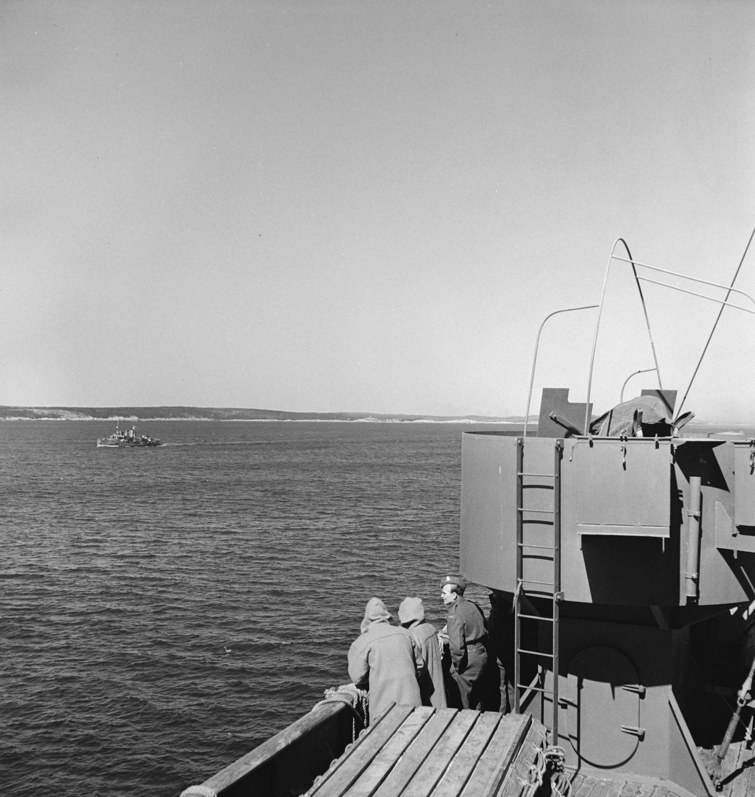 Op een Nederlands passagiersschip in dienst voor troepentransport. Bijschrift: "Off the coast of Canada. Canadian destroyer on patrol"