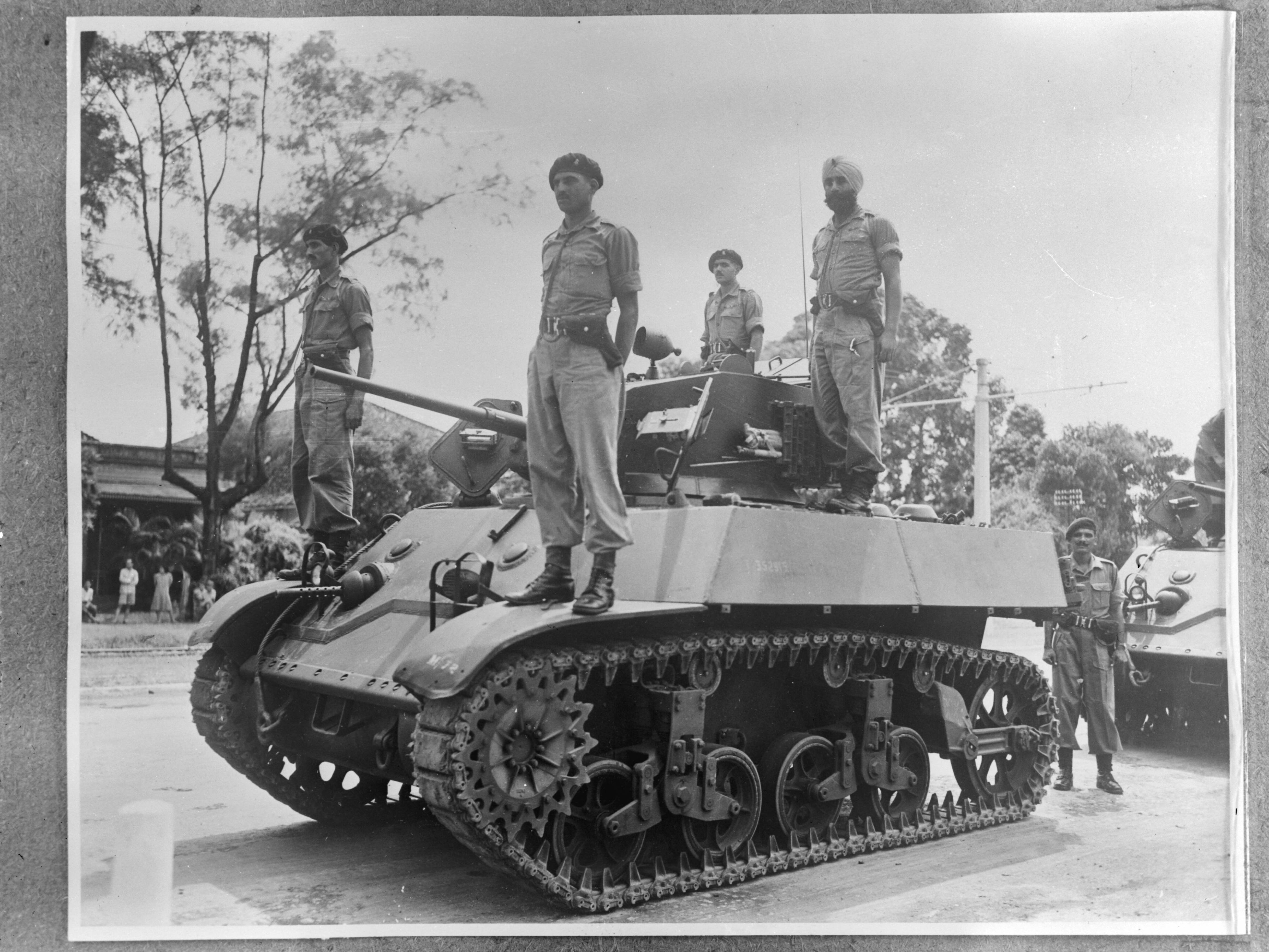 Batavia. Intocht Britse troepen met Stuart-tanks. Lichte verkenningstank met vier Brits-Indiërs rechtop staand op de tank