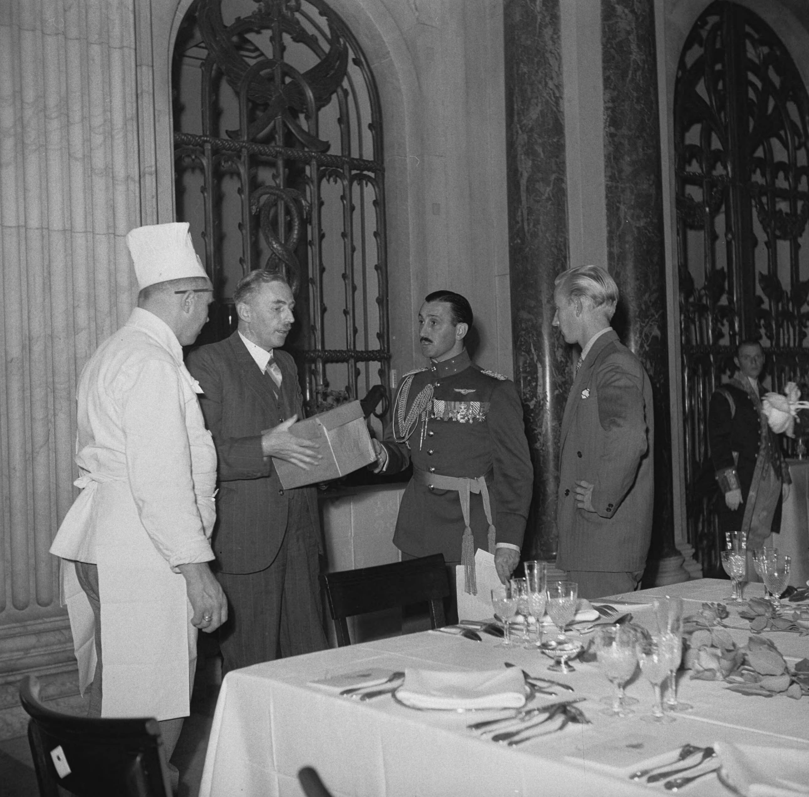 Kapitein in gala-uniform in besperking met twee heren in burger en een kok in het Paleis op de Dam
