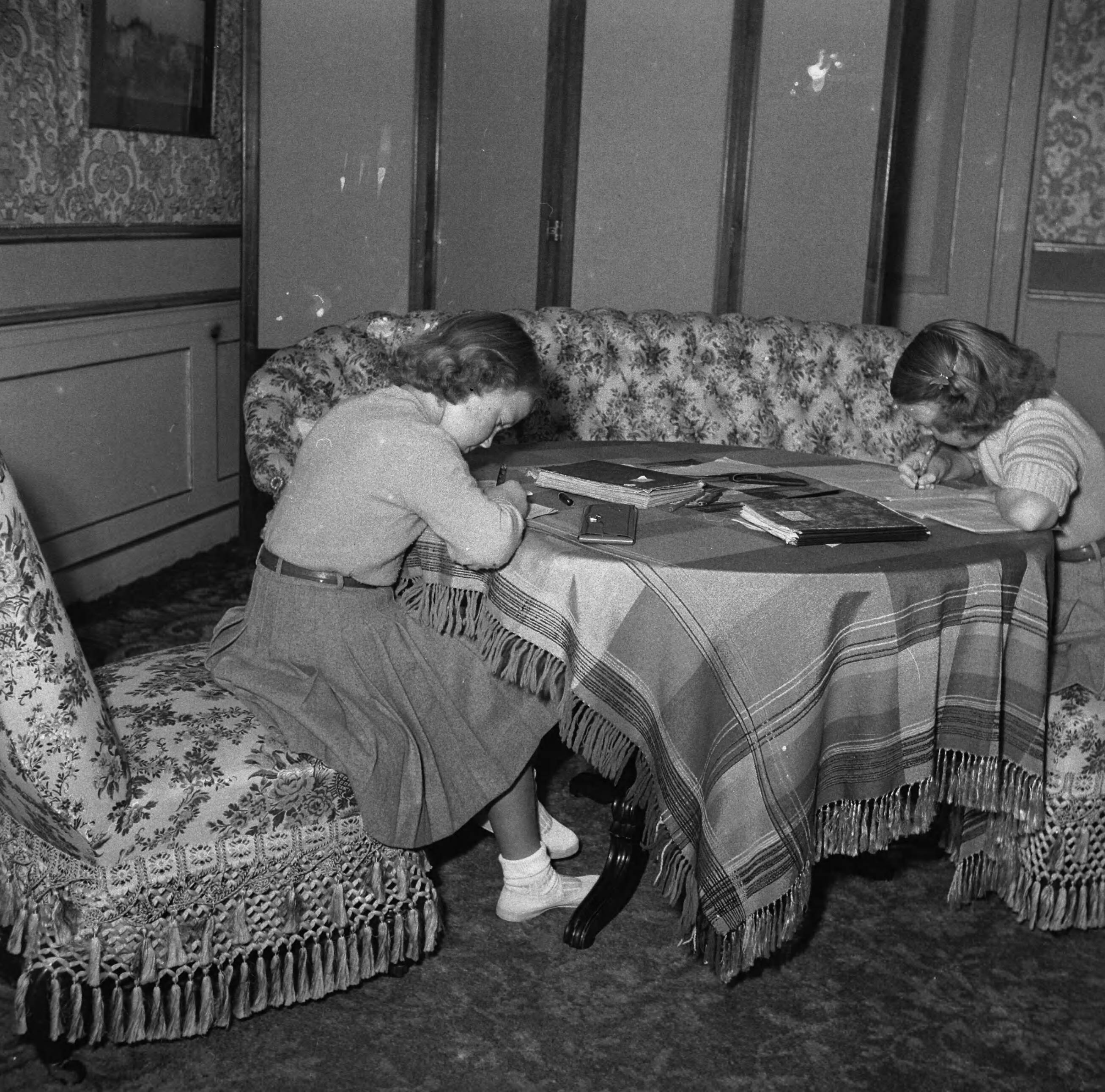 Prinses Beatrix en Renee Röell ? bezig met huiswerk
