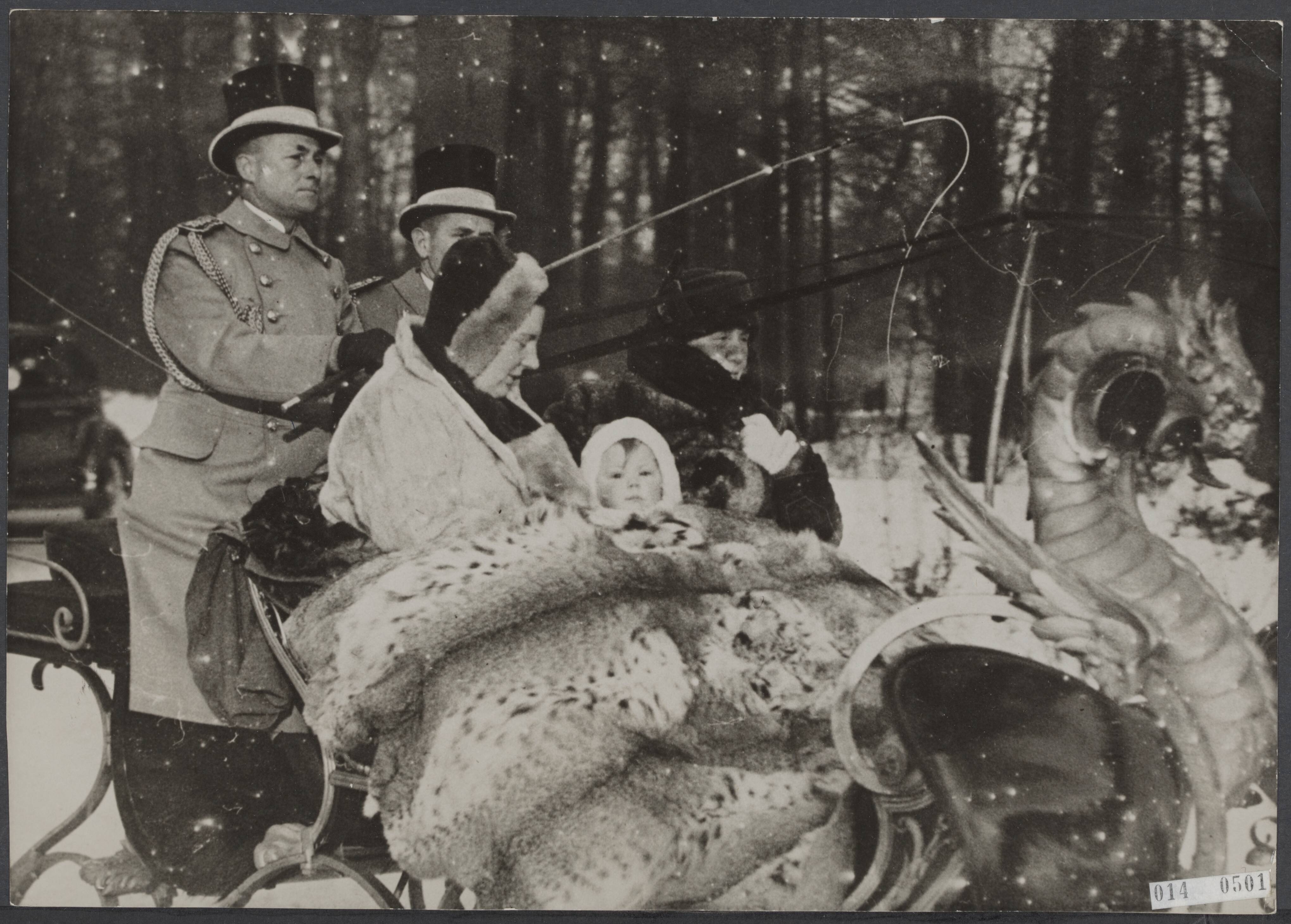 Prinses Juliana, prinses Beatrix en koningin Wilhelmina maken een tocht per arreslee door het Haagse Bos