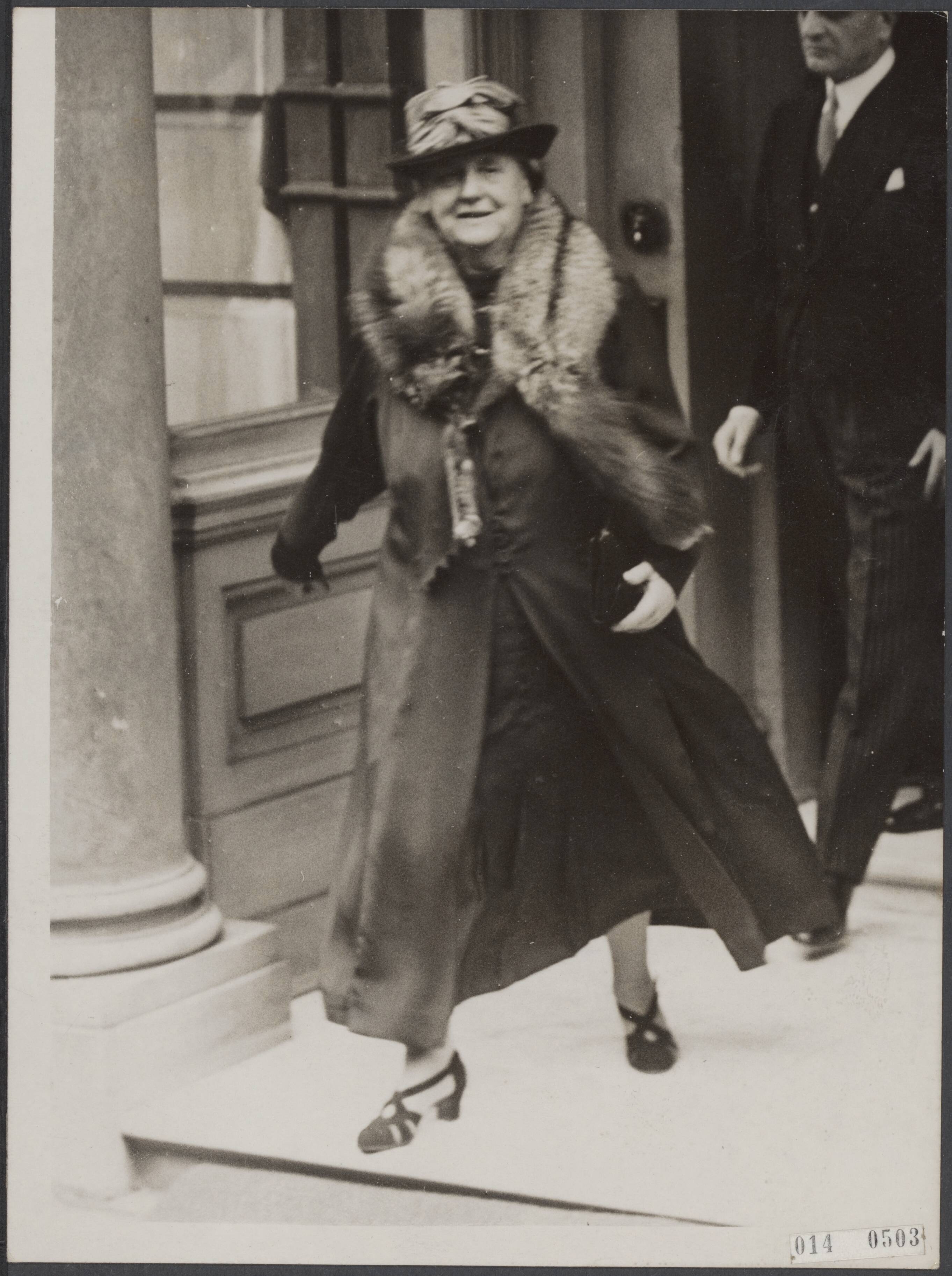 Koningin Wilhelmina verlaat de Joegoslavische ambassade in Londen, na het bijwonen van het huwelijk van koning Peter van Joegoslavië