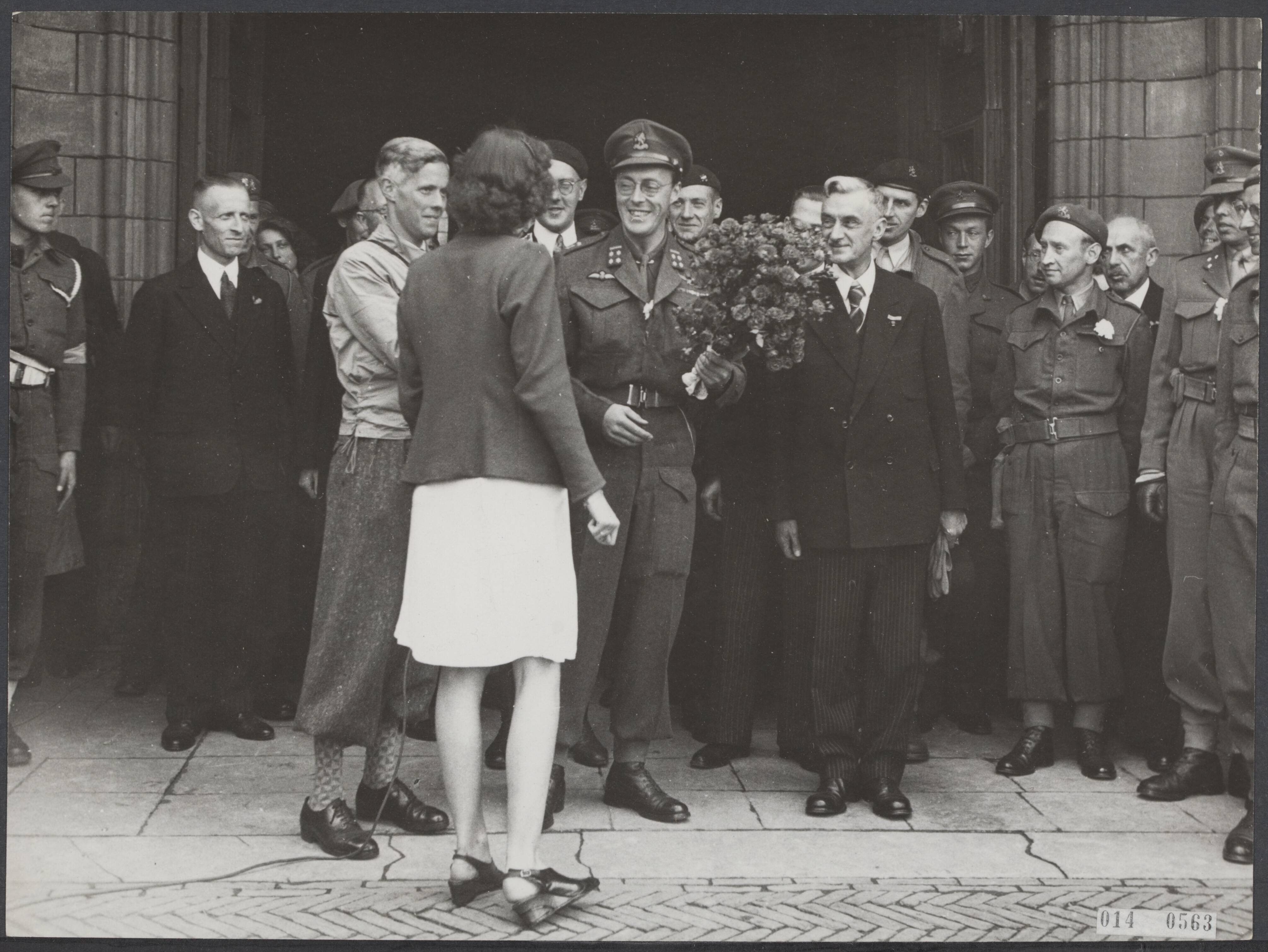 Bij het verlaten van de Grote Kerk te Delft, waar hij een krans legde op de graftombe van prins Willem de Zwijger worden hem vanwege zijn verjaardag bloemen aangeboden