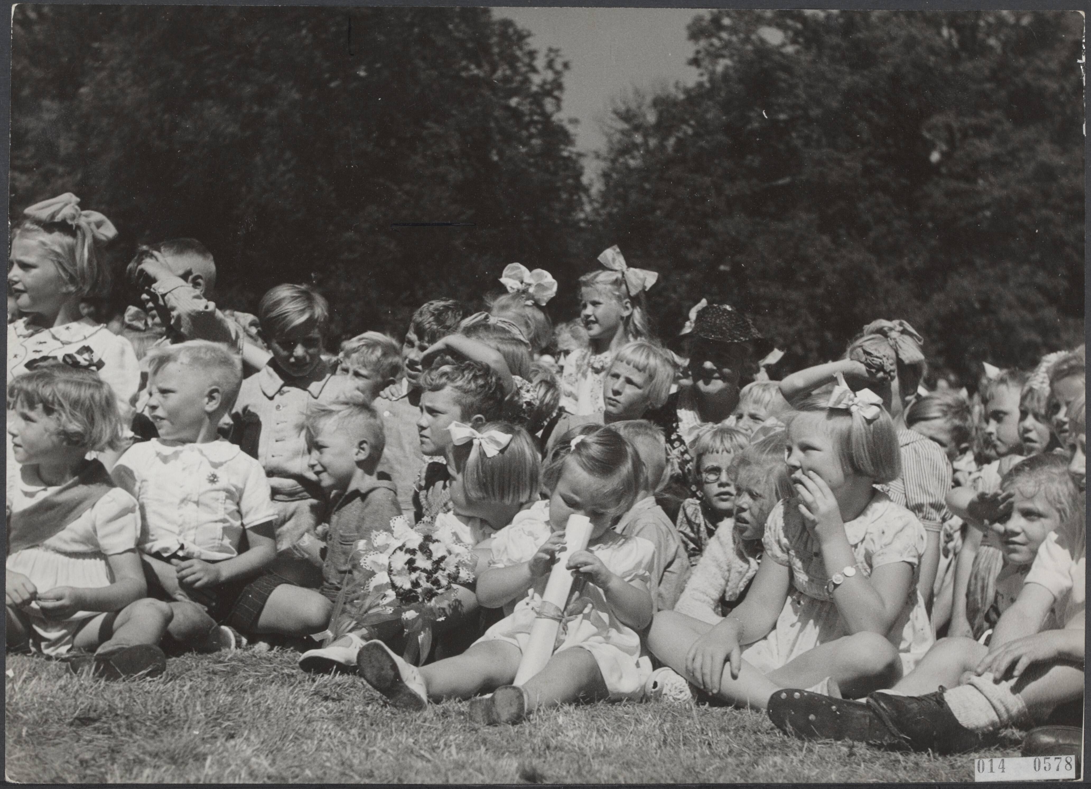 Verjaardag prinses Irene. Tuinfeest voor kinderen op paleis Soestdijk. Vooraan prinses Beatrix en prinses Margriet