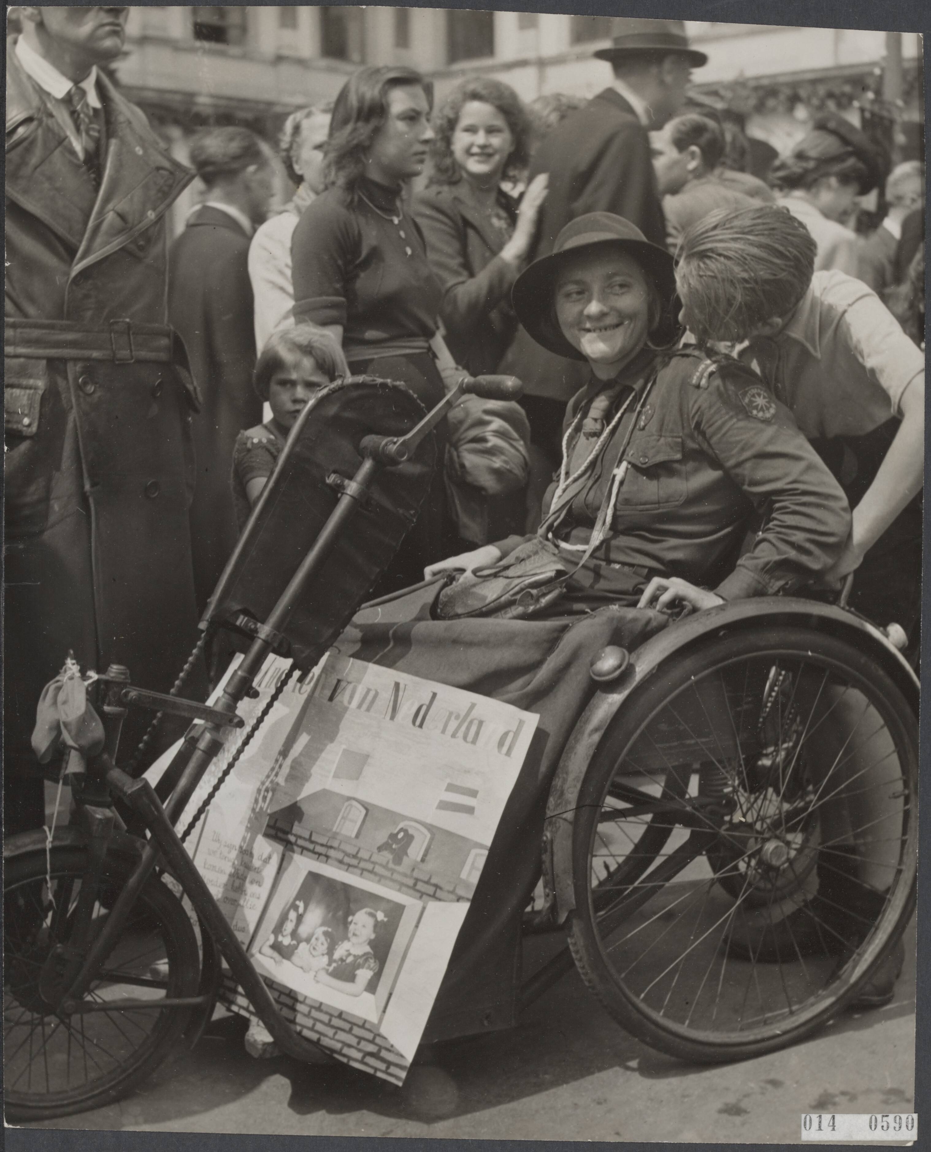 Koningin Wilhelmina terug in Den Haag op paleis Noordeinde. Invalidenwagens, getooid met foto's van het prinselijk gezin kregen een plaatsje op de voorste rij