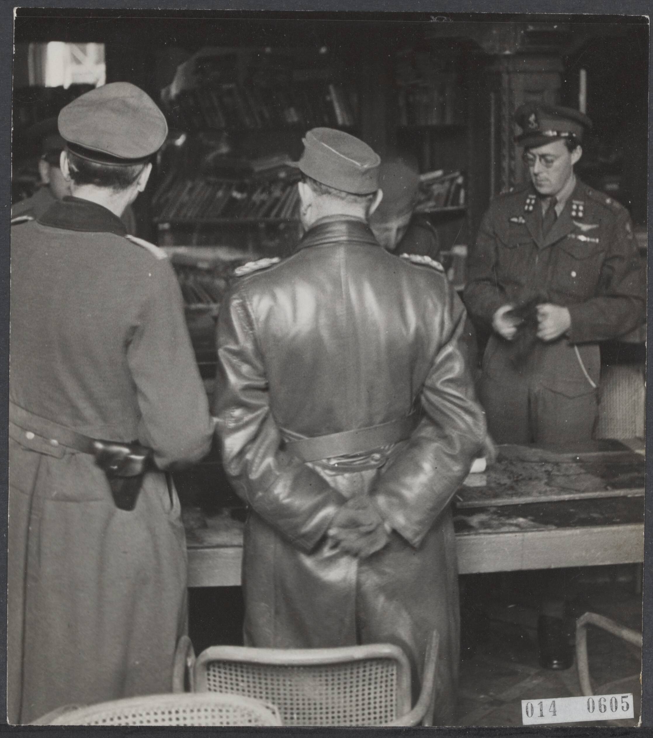Capitulatiebesprekingen in Hotel de Wereld te Wageningen. Links Op de rug gezien de chef-staf van het Duitse 24e Leger Paul Reichelt. Rechts een stafofficier of tolk in leren jas. Aan de andere kant van de tafel prins Bernhard