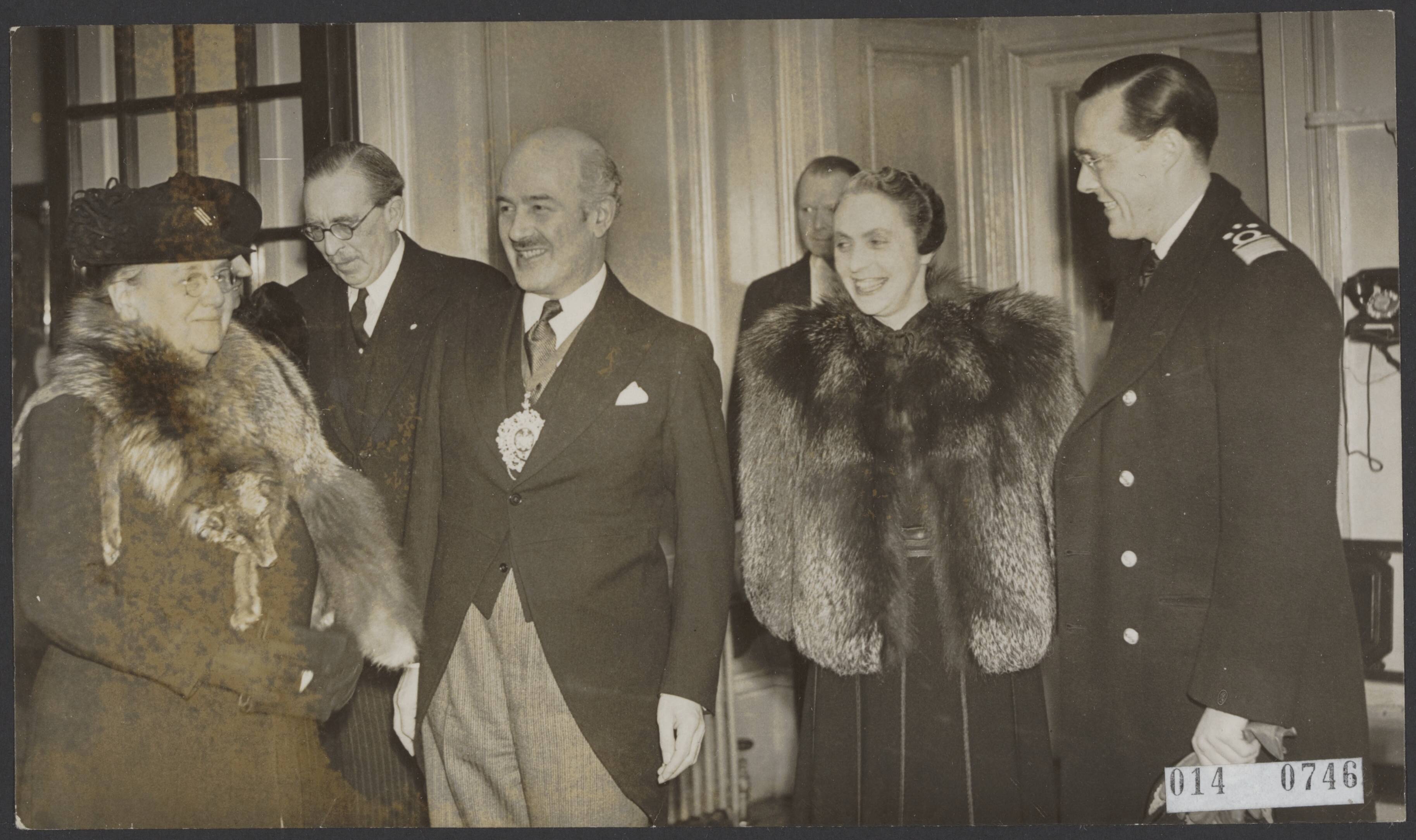 De Lord Mayor en Mayoress van Londen, sir Samuel en lady Jospeh, gaven een lunch ter ere van koningin Wilhelmina in het Mansion House. Vlnr. koningin Wilhelmina, de lord Mayor, de lady Mayoress en prins Bernhard tussen Wilhemina en de mayor de Nederlandse ambassadeur Michiels van Kessenich