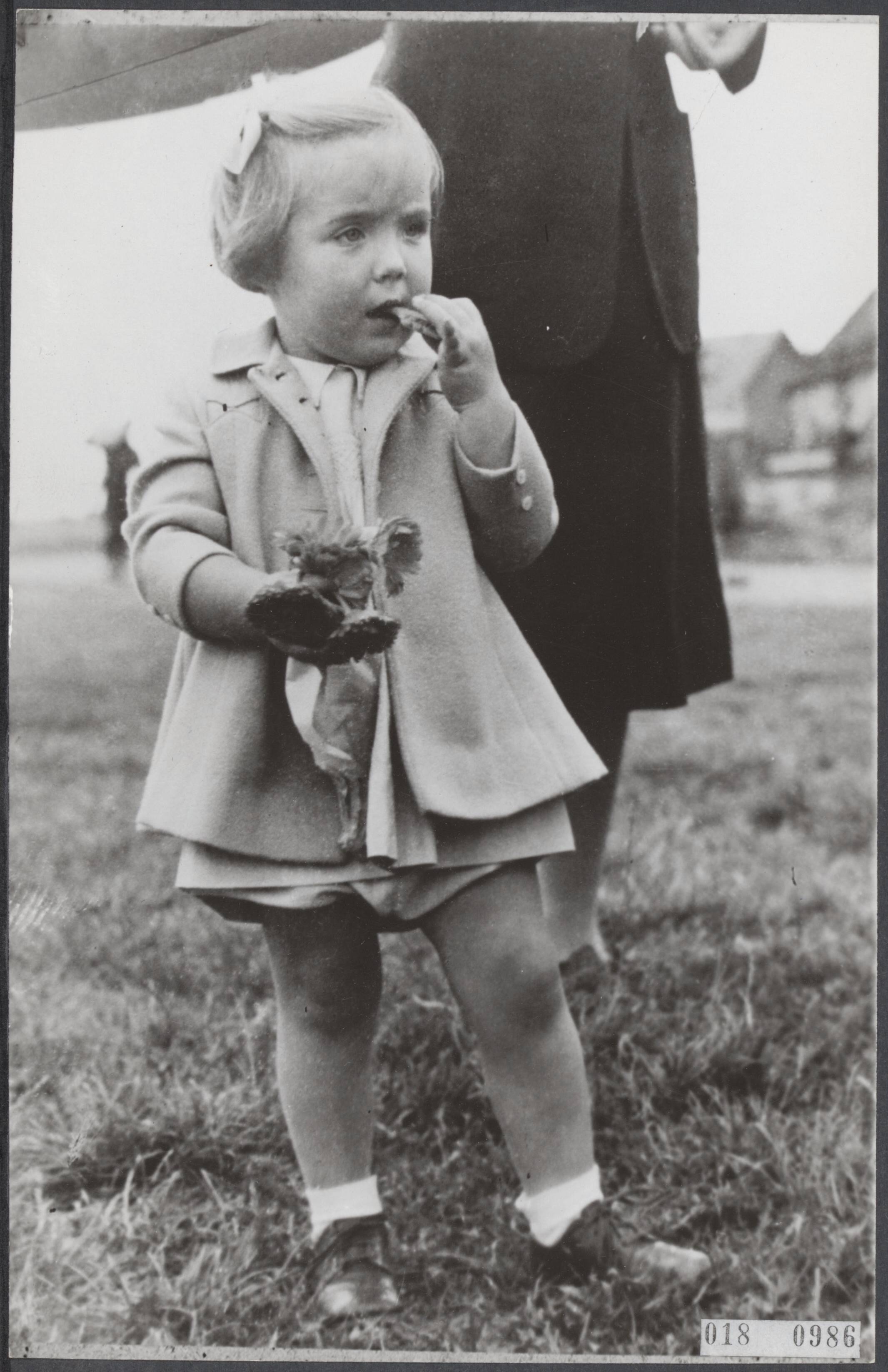 Prinses Margriet eet een koekje, na aankomst op vliegveld Teuge