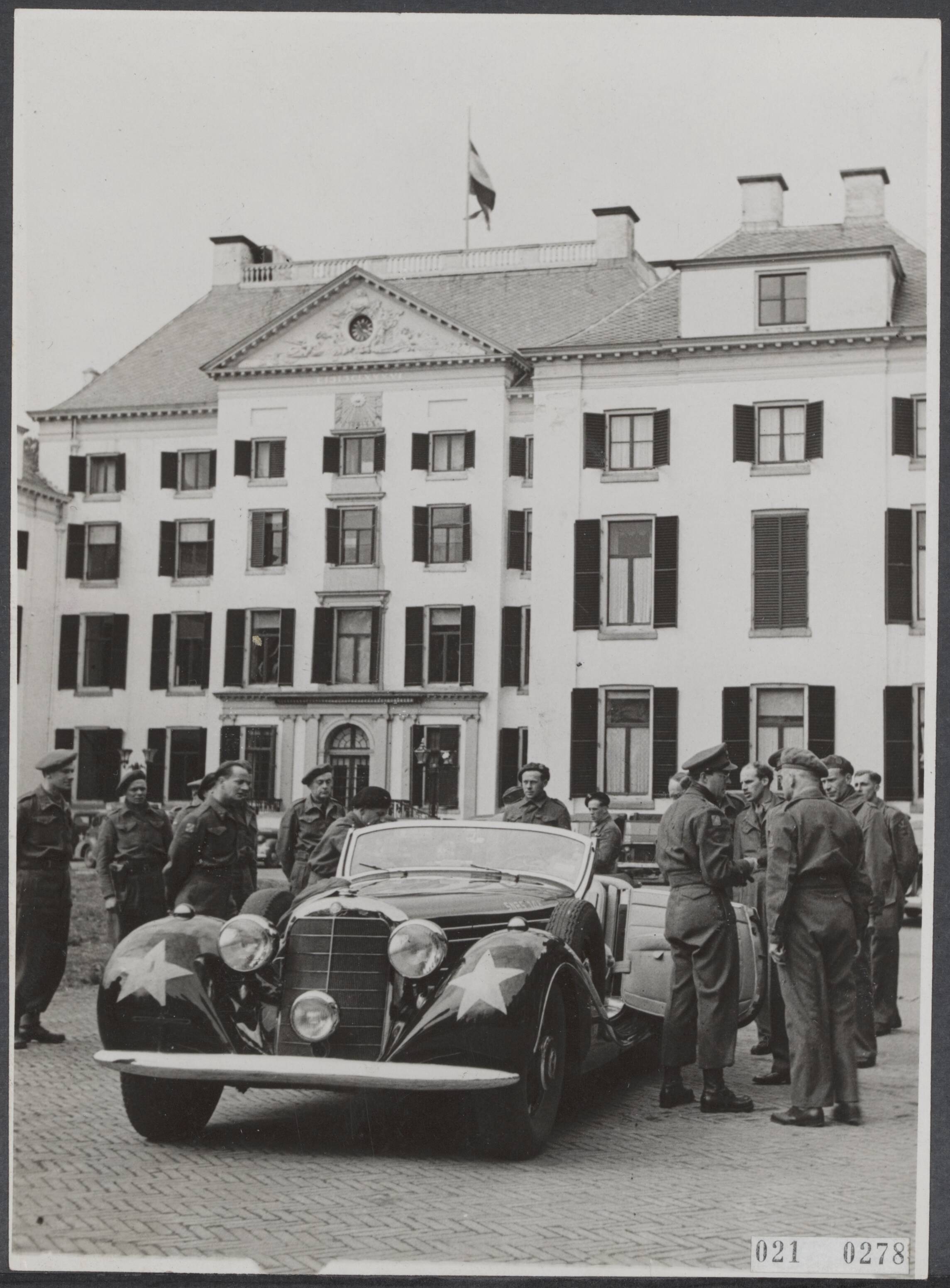 Prins Bernhard met zijn stafofficieren op het Loo, op het punt om zich voor de ondertekening van de Duitse capitulatie naar Wageningen te begeven