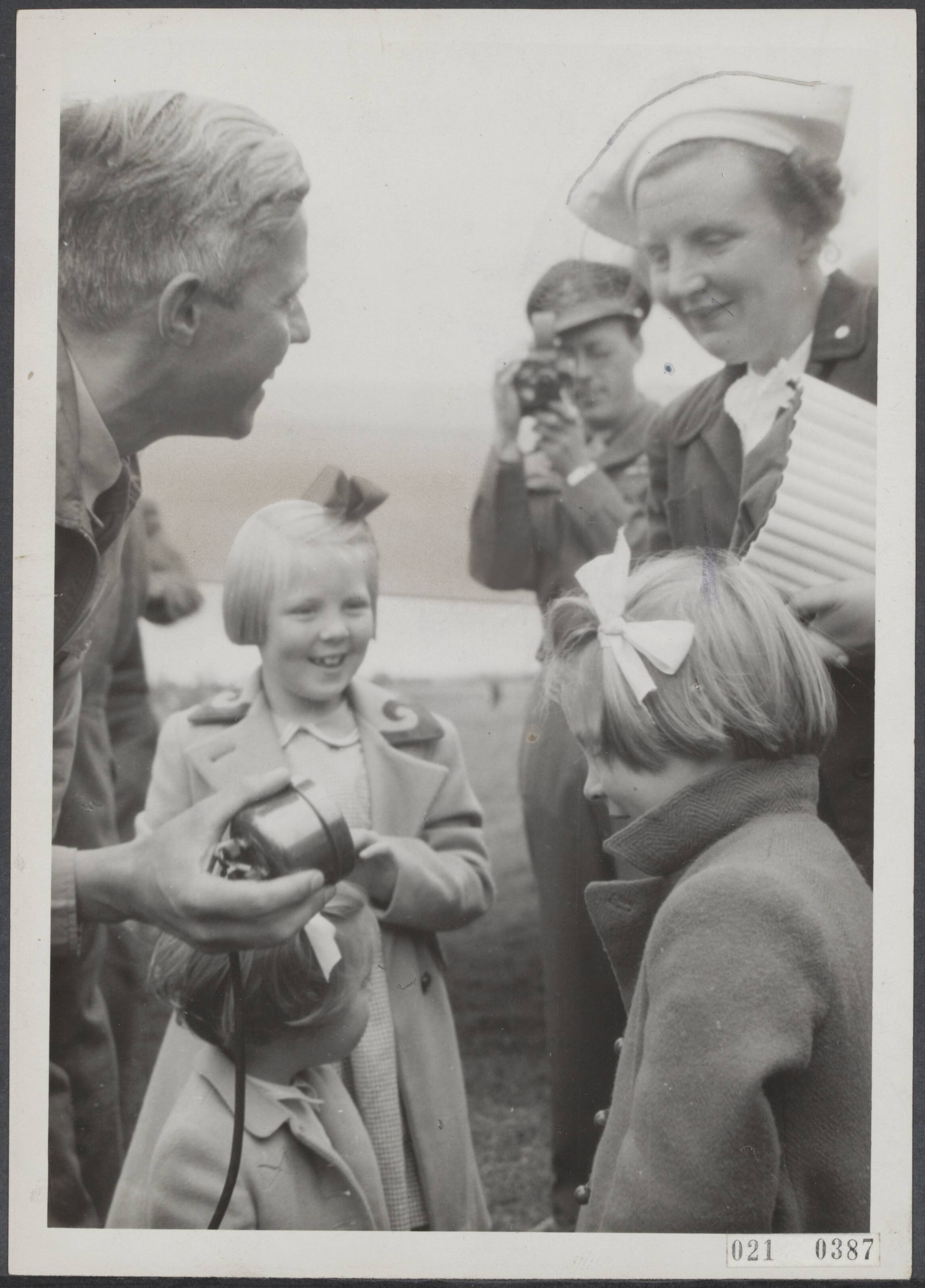 Terugkomst in Nederland van prinses Juliana en de prinsessen op vliegveld Teuge. Prins Bernhard filmt zijn familie, terwijl ze geinterviewd worden door radioverslaggever Frits Thors