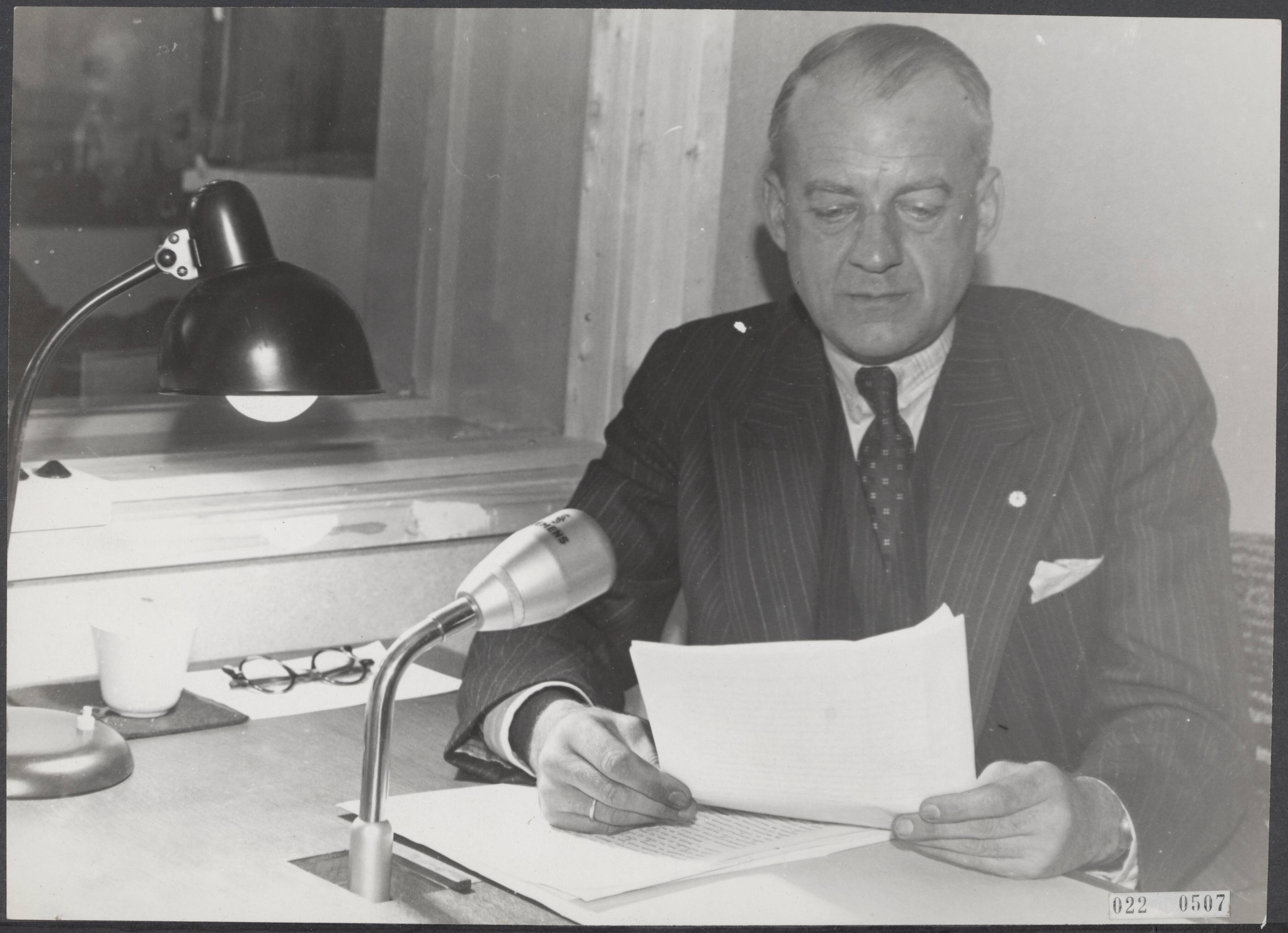 J. Meynen, minister van Oorlog, voor de radiomicrofoon