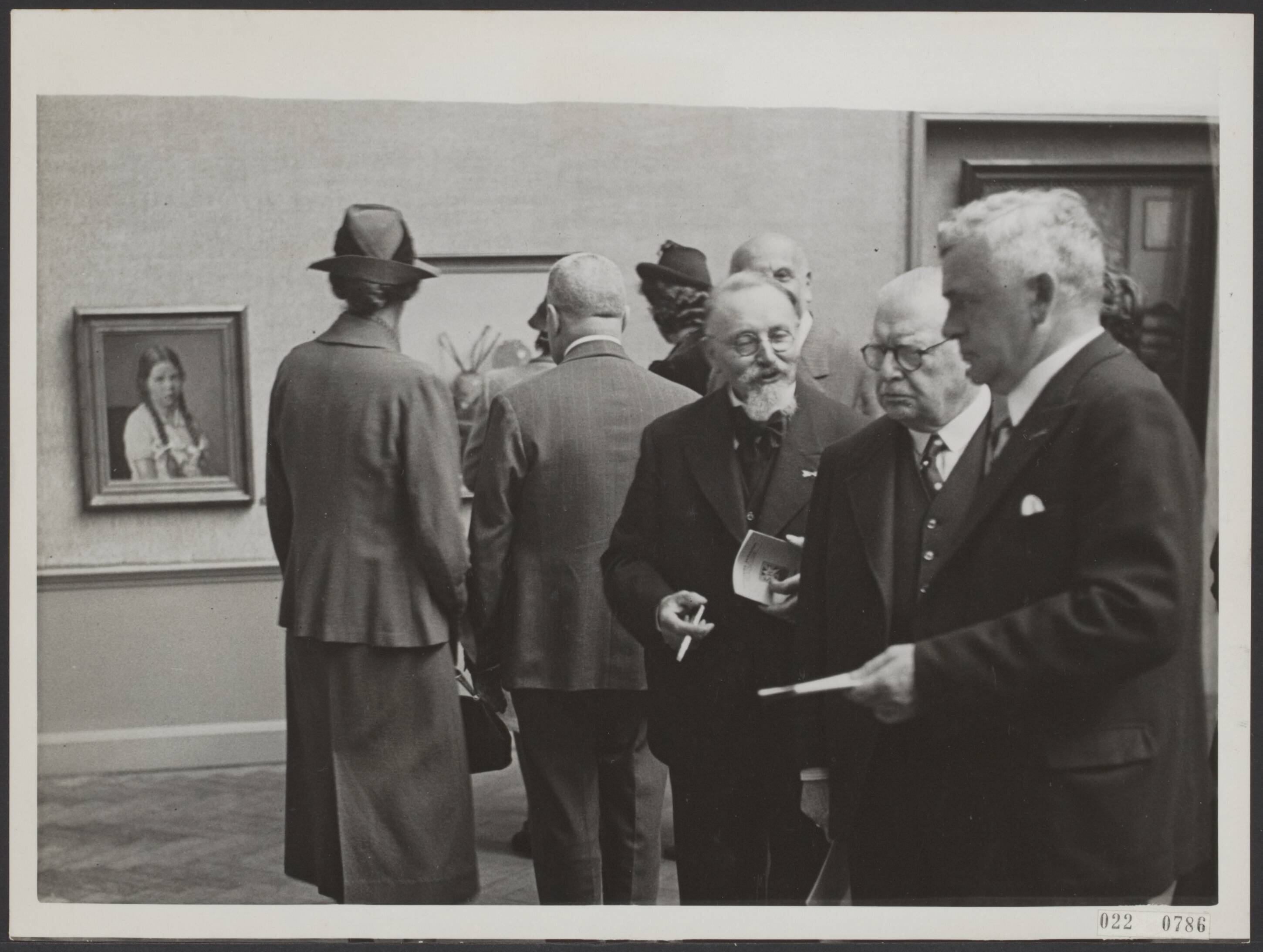 Heden is te Amsterdam het kunstseizoen geopend met een tentoonstelling van de Vereniging Rembrandt in het Stedelijk Museum. De Commissaris in Noord-Holland, mr. dr. A. baron Röell en wthouder mr. G.CJ.D. Kropman (rechts) worden door Vereniging Rembrandt's voorzitter De Boer (links) rondgeleid