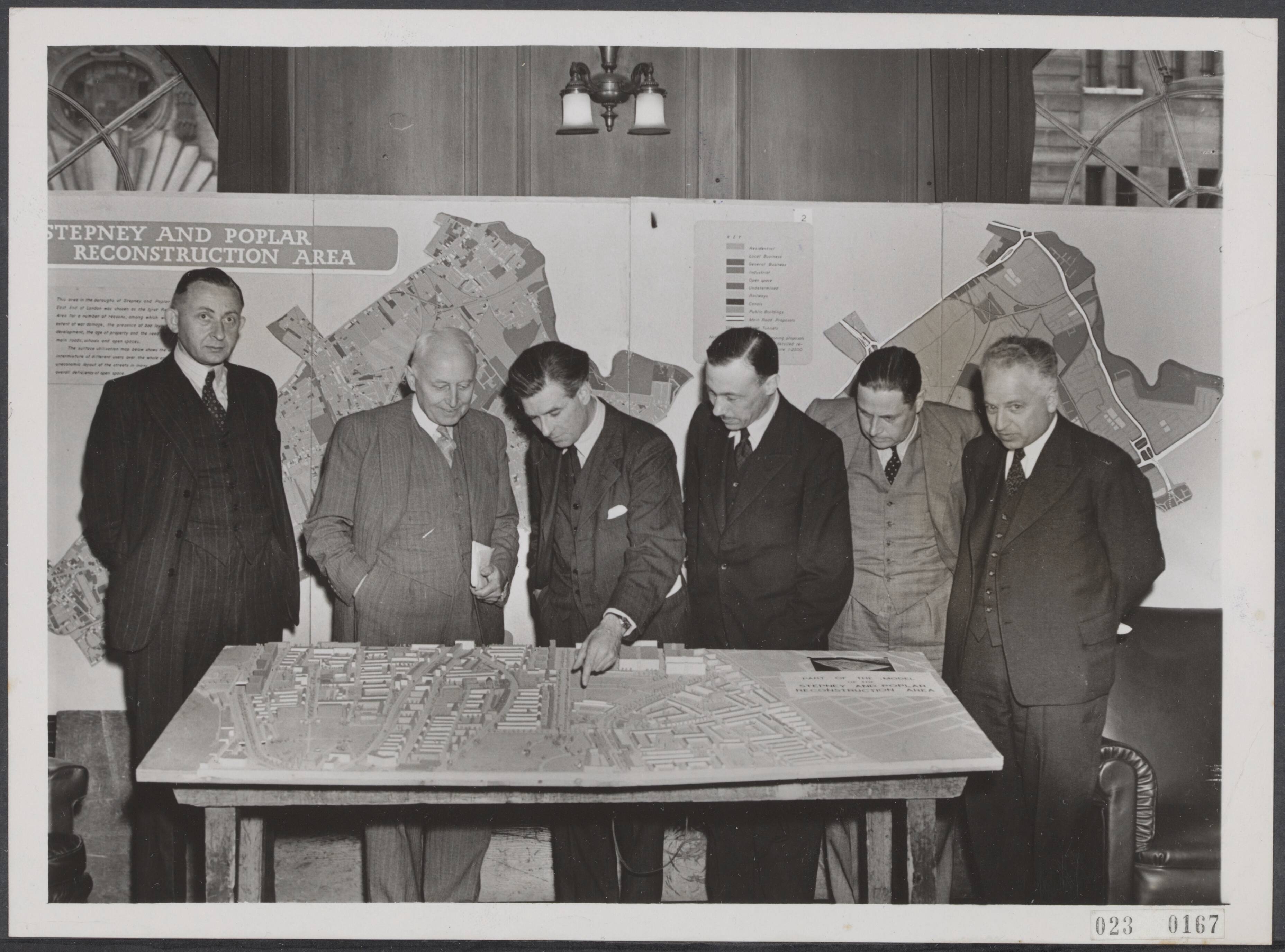 Nederlandse architecten en stedebouwkundigen bezoeken Londen. Vlnr. Dr. F. Bakker Schut van de Rijksdienst van Nationale Planning; mr. W.M. Dudok, architect en stedebouwkundige, ontwerper van het reconstructieplan voor Den Haag; mr. M. Mathew, hoofdarchitect van de Londen County Council; mr. J. Vink, hoofd Publieke Werken en Huisvesting van Utrecht; mr. C. van Traa, architect en stedebouwkundige, directeur Stadsontwikkeling van Rotterdam; mr. Roos hoofdingenieur, sectie Huisvesting van het Nederlandse ministerie van Publieke Werken. De heer Mathew toont de bezoekers een schaalmodel voor het voorgestelde reconstructieplan voor de East End van Londen, gedeeltelijk verwoest in de Oorlog, tijdens hun bezoek aan de County Hall te Westminster