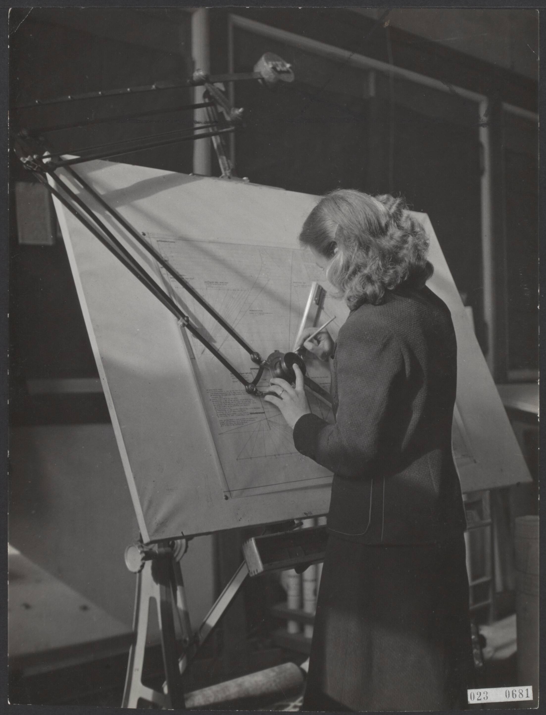 Reportage van het werk van een van Nederlands eerste vrouwelijke ingenieurs, mej. Plooijer. "..... maar ook zo, in de klare koelte van de lokaliteiten van de Technische Hogeschool te Delft, aan het tekenbord met de vreemdsoortige lineaal, welke voor dit constructiewerk wordt gebruikt"