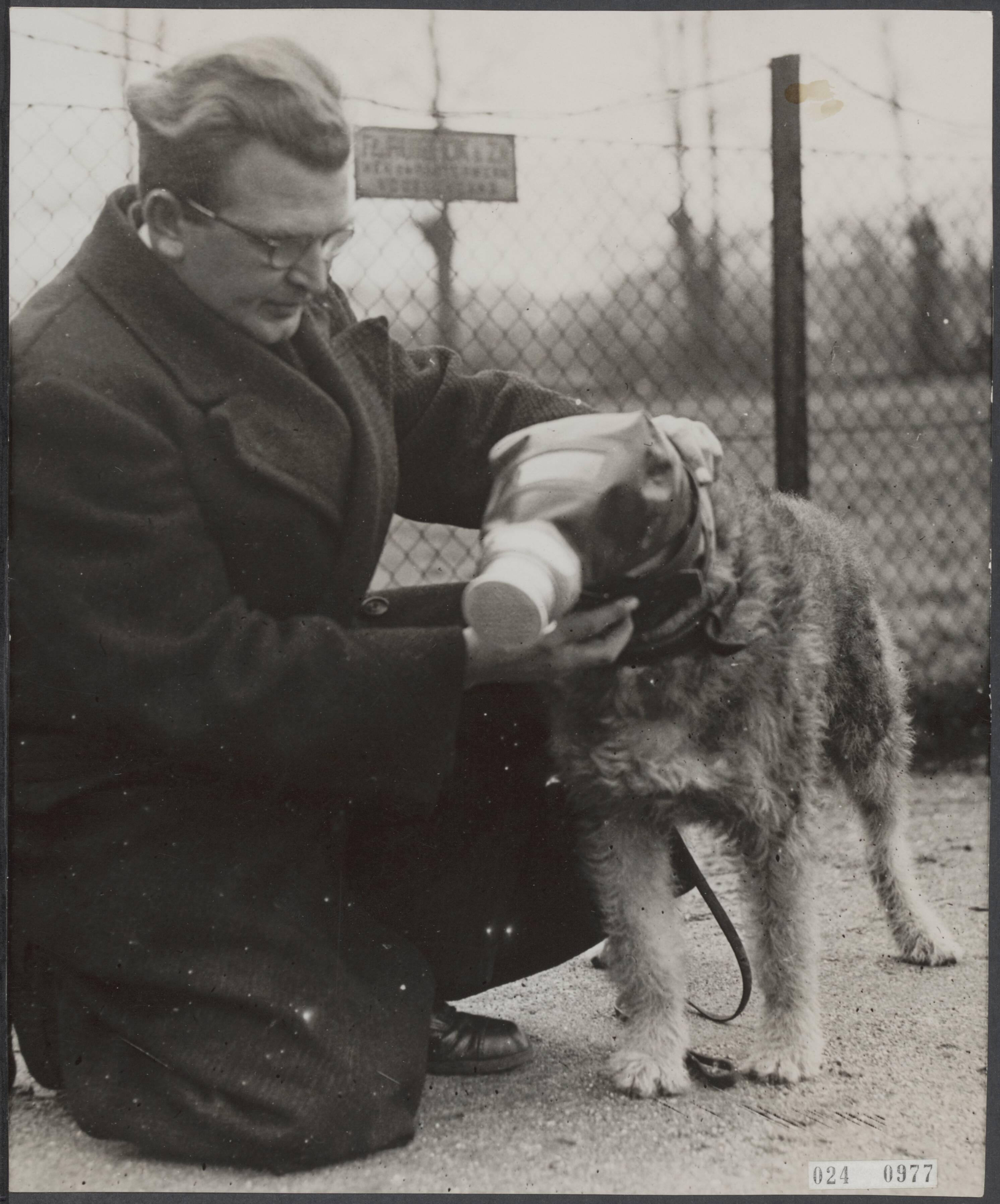 Proefneming met een gasmasker voor honden door het Haagse Propaganda Bureau. Op deze foto de beste Nederlandse politiehond
