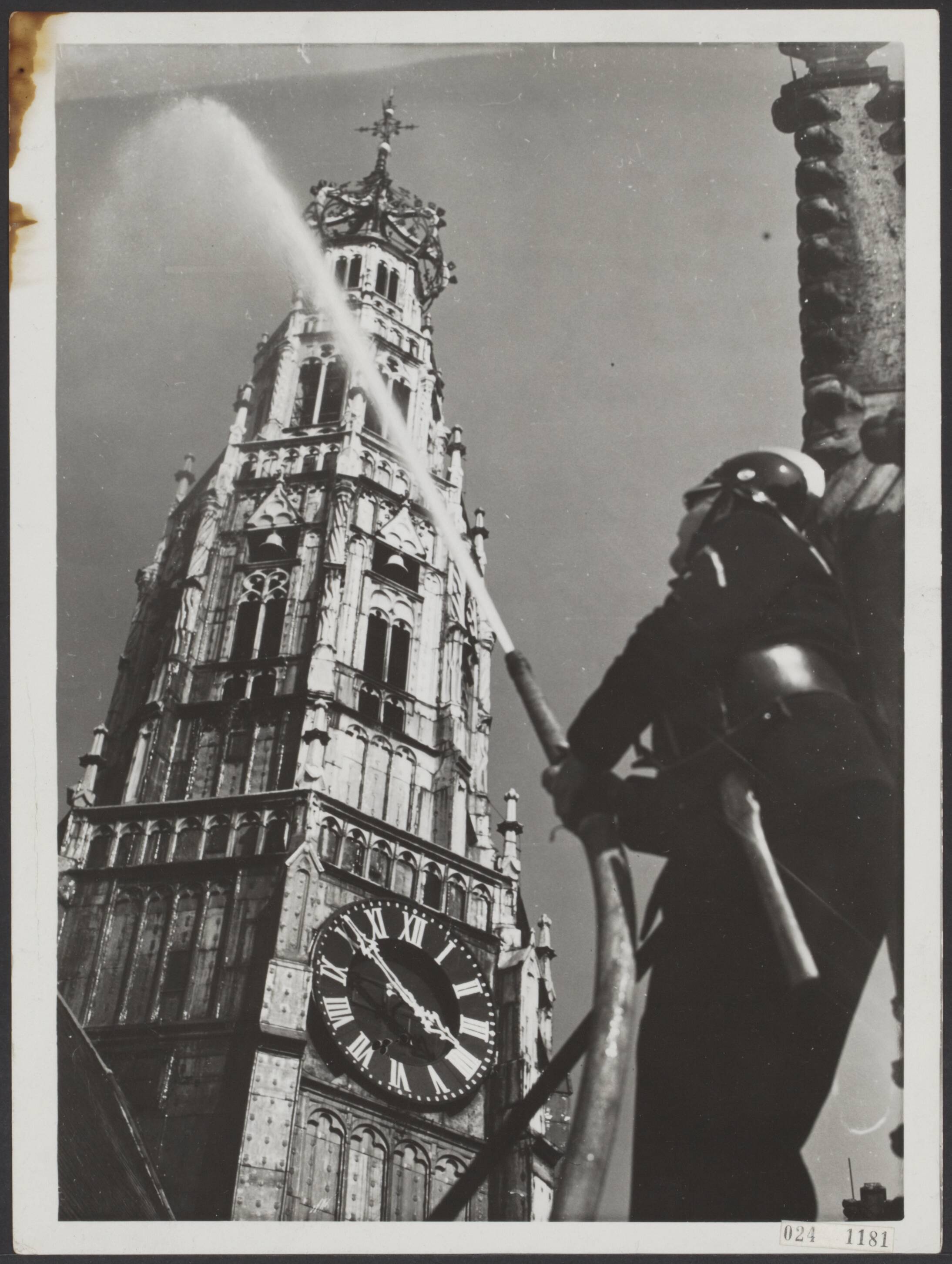 De Haarlemse brandweer heeft gisteren de nieuwe brandblusinstallatie, welke in de Grote of St. Bavo op de Groote Markt te Haarlem is aangebracht, gedemonstreerd voor burgemeester en wethouders. Terwijl de brandweerlieden vanaf de straat "het vuur" bestrijden, stroomt het water van de toren af