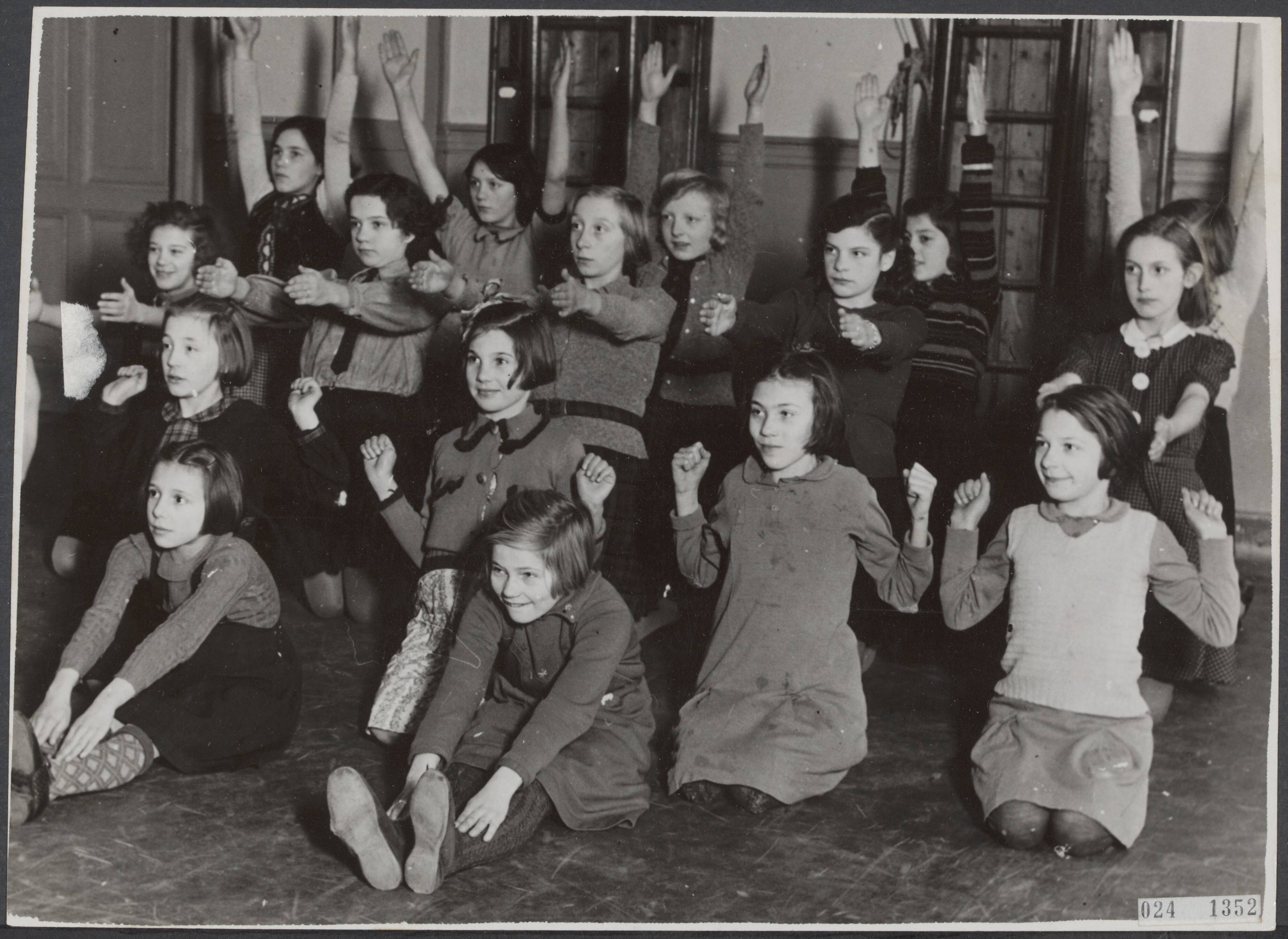 De meisjes tijdens een gymnastiekles in "Ons Huis" bezig met vrije oefeningen