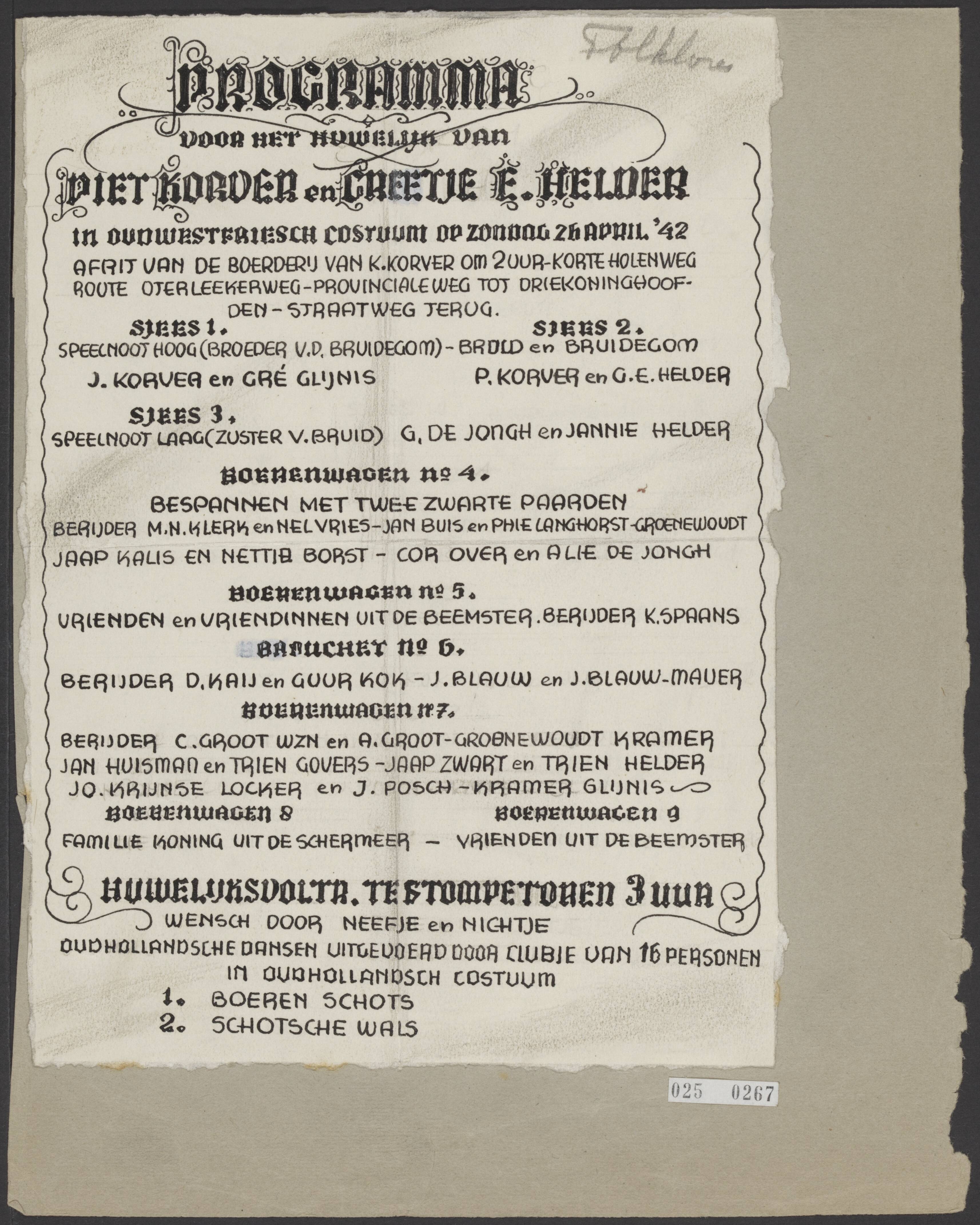 Programma voor het huwelijk van Piet Korver en Greetje E. Helder in oud West-Fries kostuum op zondag 26 april 1942 te Stompetoren