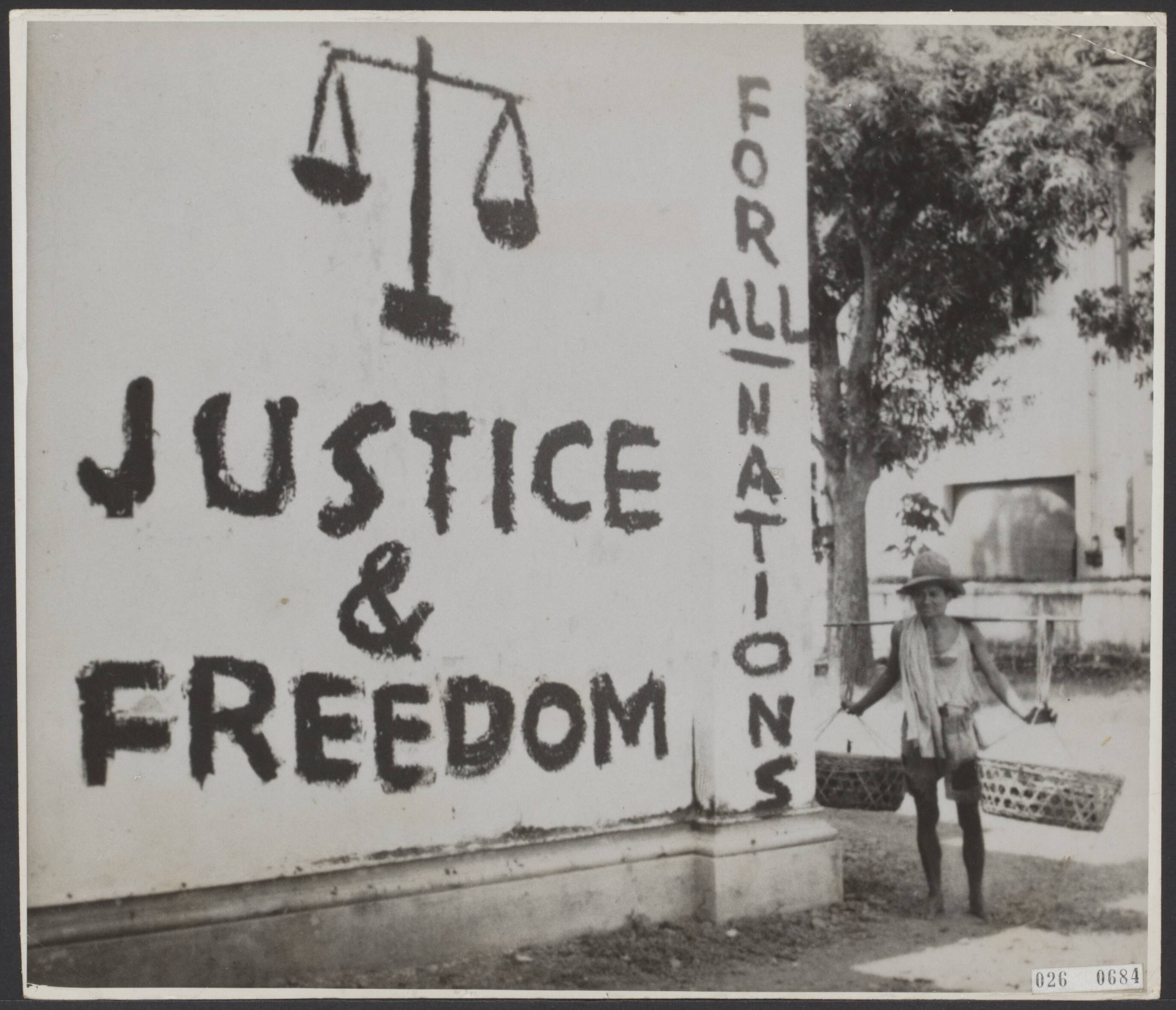Slogans in het Engels op muren bij de aankomst van Engelse troepen in Nederlands-Indië