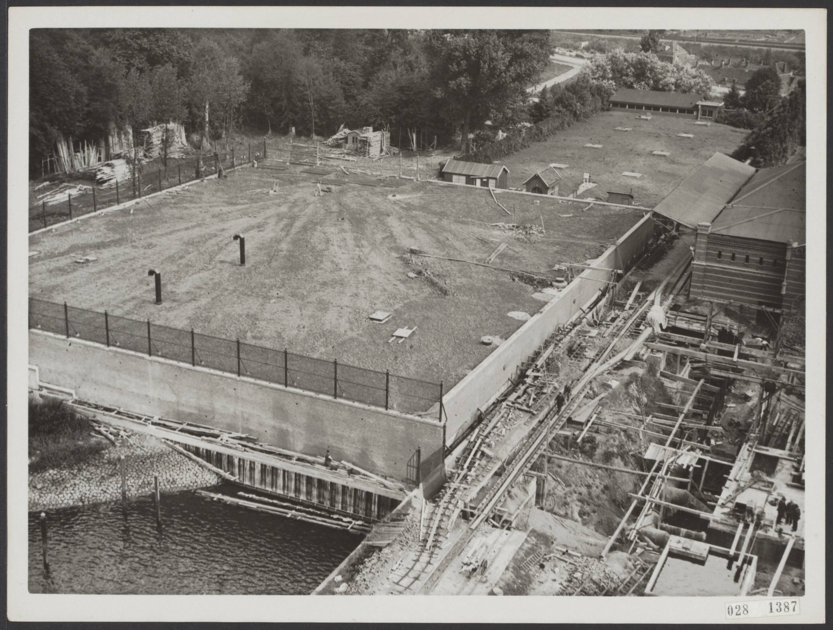 Het Gemeentelijk Waterleidingbedrijf te Rotterdam is uitgebreid met 2 thans nagenoeg gereed gekomen reinwaterkelders, met een totaal inhoud van 20.000 m3. Het 's-nachts door de filters verwerkte water wordt in deze kelders bewaard om overdag tezamen met het dan verwerkte water te worden gedistribueerd over het buizennet. Overzicht van de kelders, die onder één dak gedeeltelijk in de grond zijn gebouwd. Rechts de bijbehorende pompinstallatie in aanbouw.