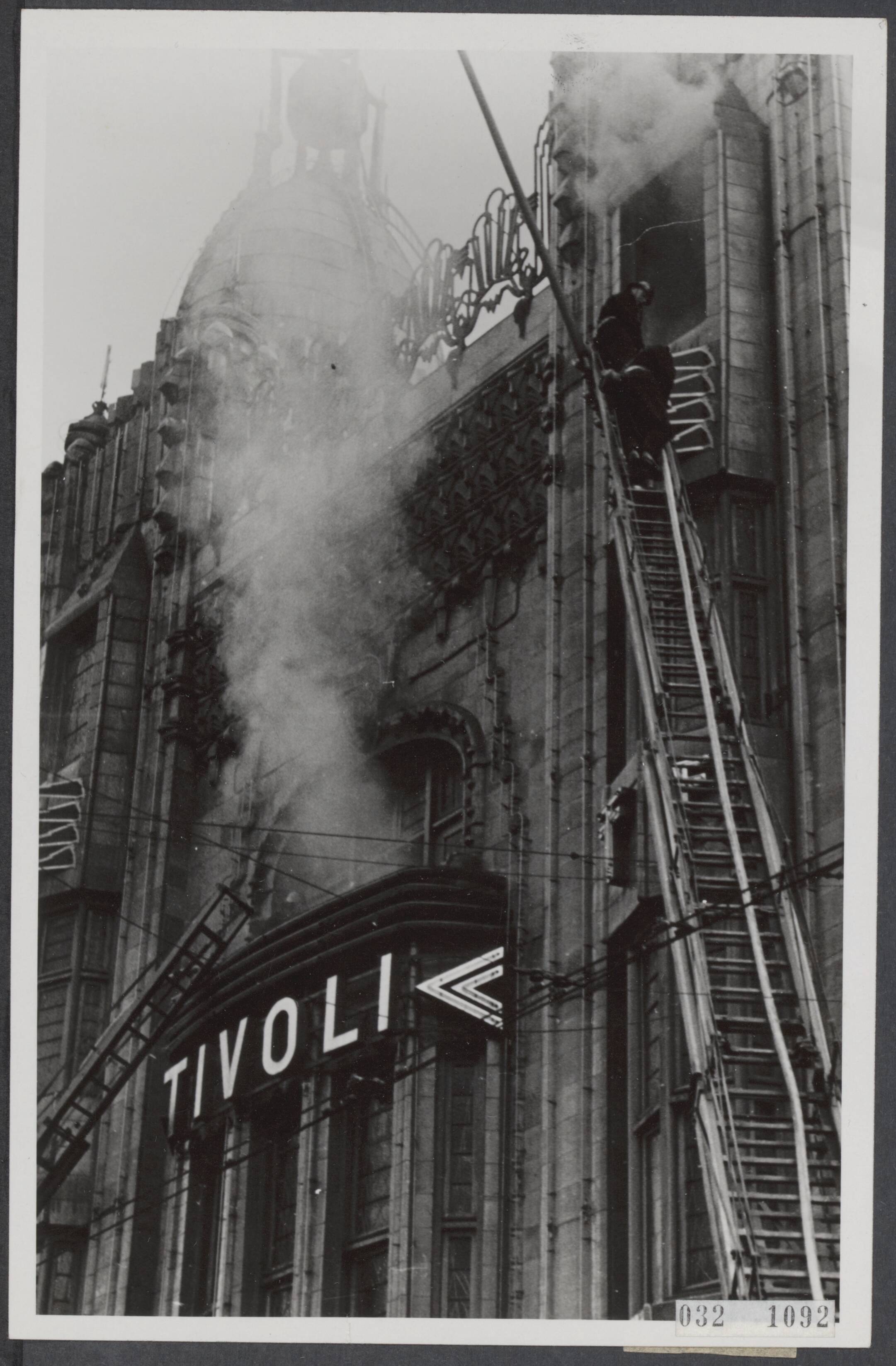 Brand in bioscoop Tivoli was Tuschinski, red. te Amsterdam. De brandweer bij de bluswerkzaamheden
