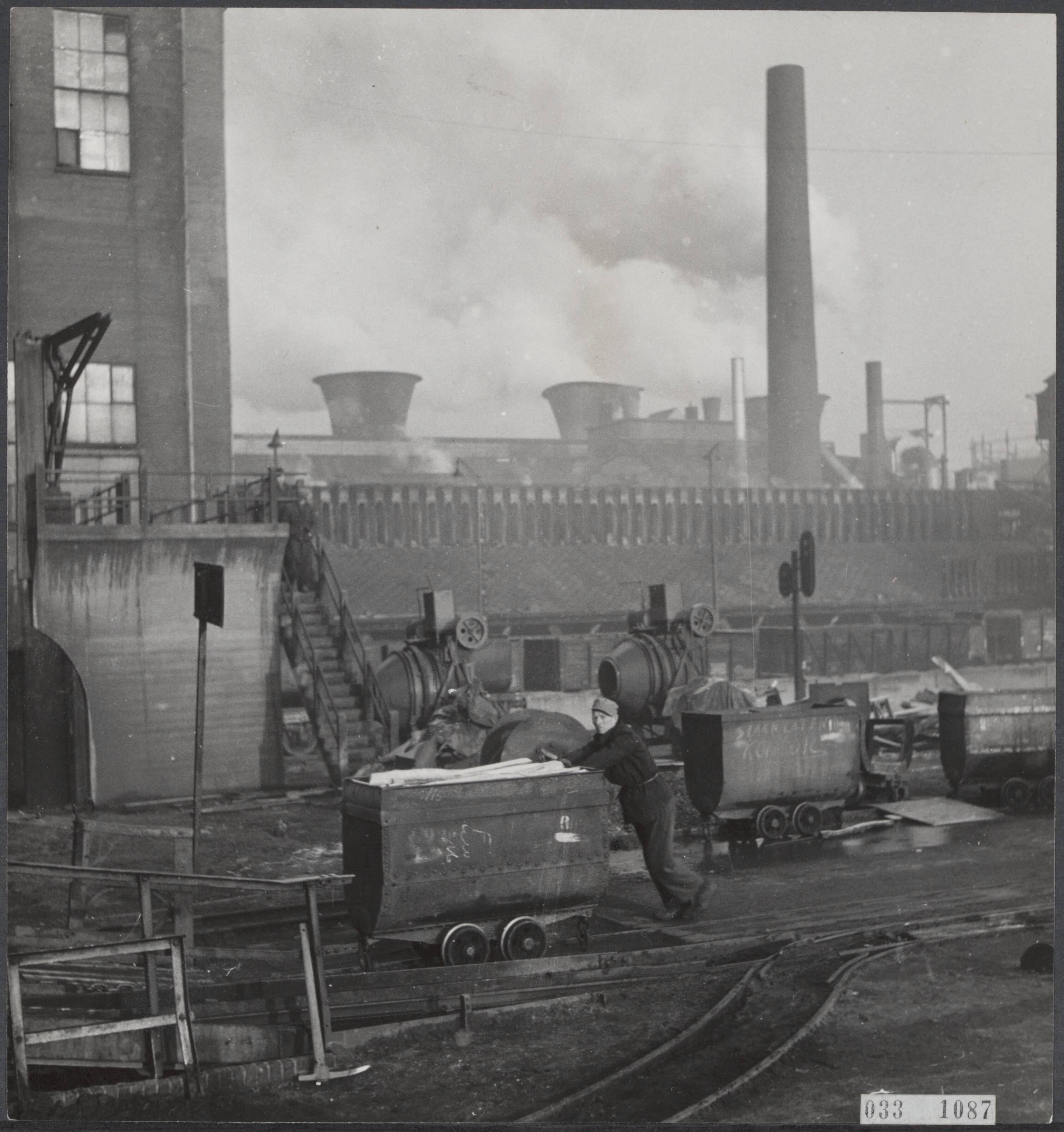 Kolenmijnen Limburg. De kleine spoorwagons worden gebruikt om houten balken te halen uit de houtopslag. Op de achtergrond energiecentrale