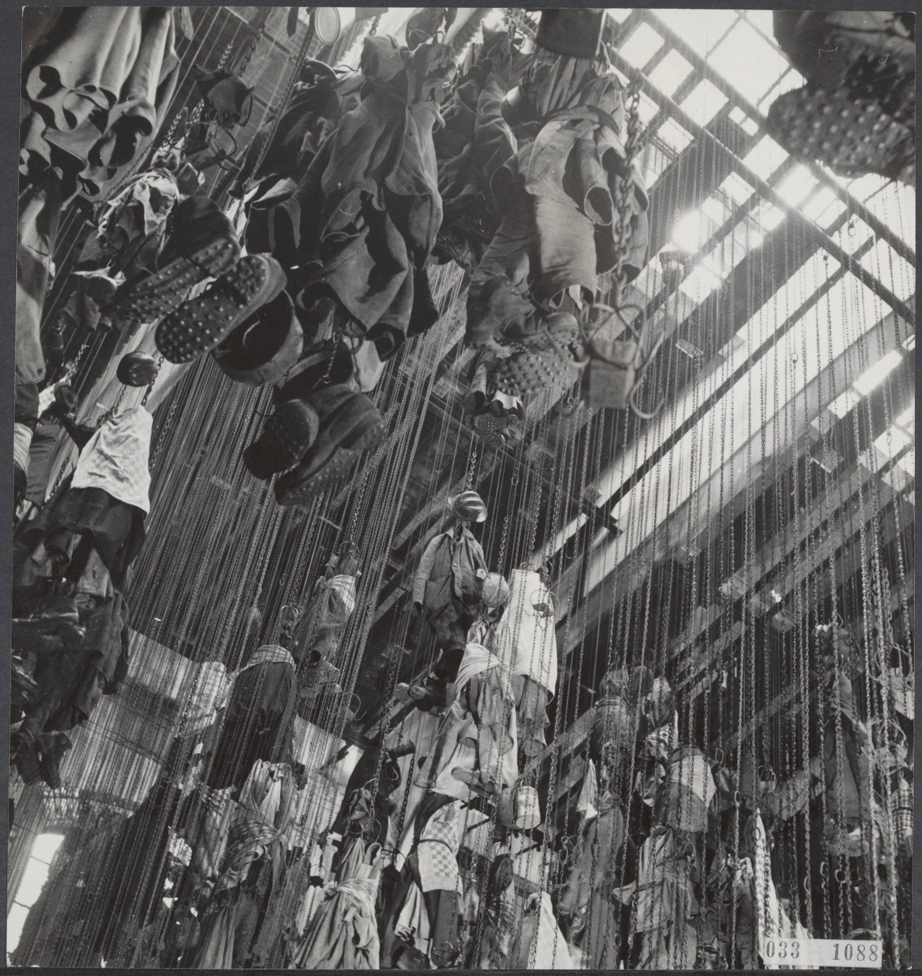 Kolenmijnen Limburg. Kledinghaken in het badlokaal. Hier werden de werk en gewone kleren opgehangen en met een ketting omhoog getrokken. Omdat niet iedereen dezelfde dienst had beschikte men over twee kettingen. De reden: om te voorkomen dat vuile kleren de goede kleren van de buurman zouden kunnen verontreinigen. (de goede kleren hingen op een andere plaats).