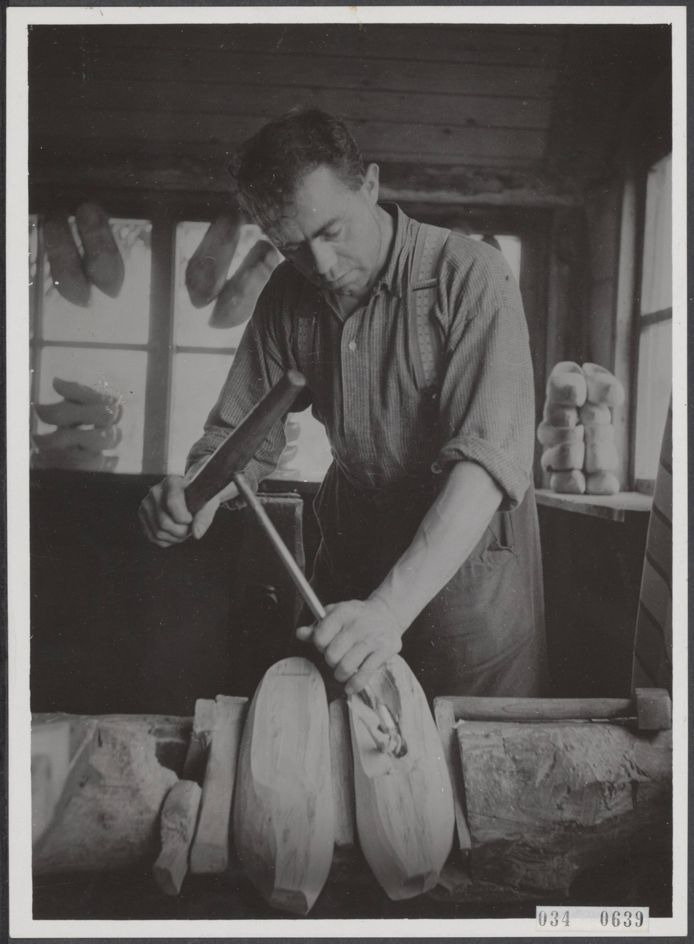 Een klompenmaker in Garderen (Gelderland), die ten gevolge van de leerschaarste nu handenvol werk heeft
