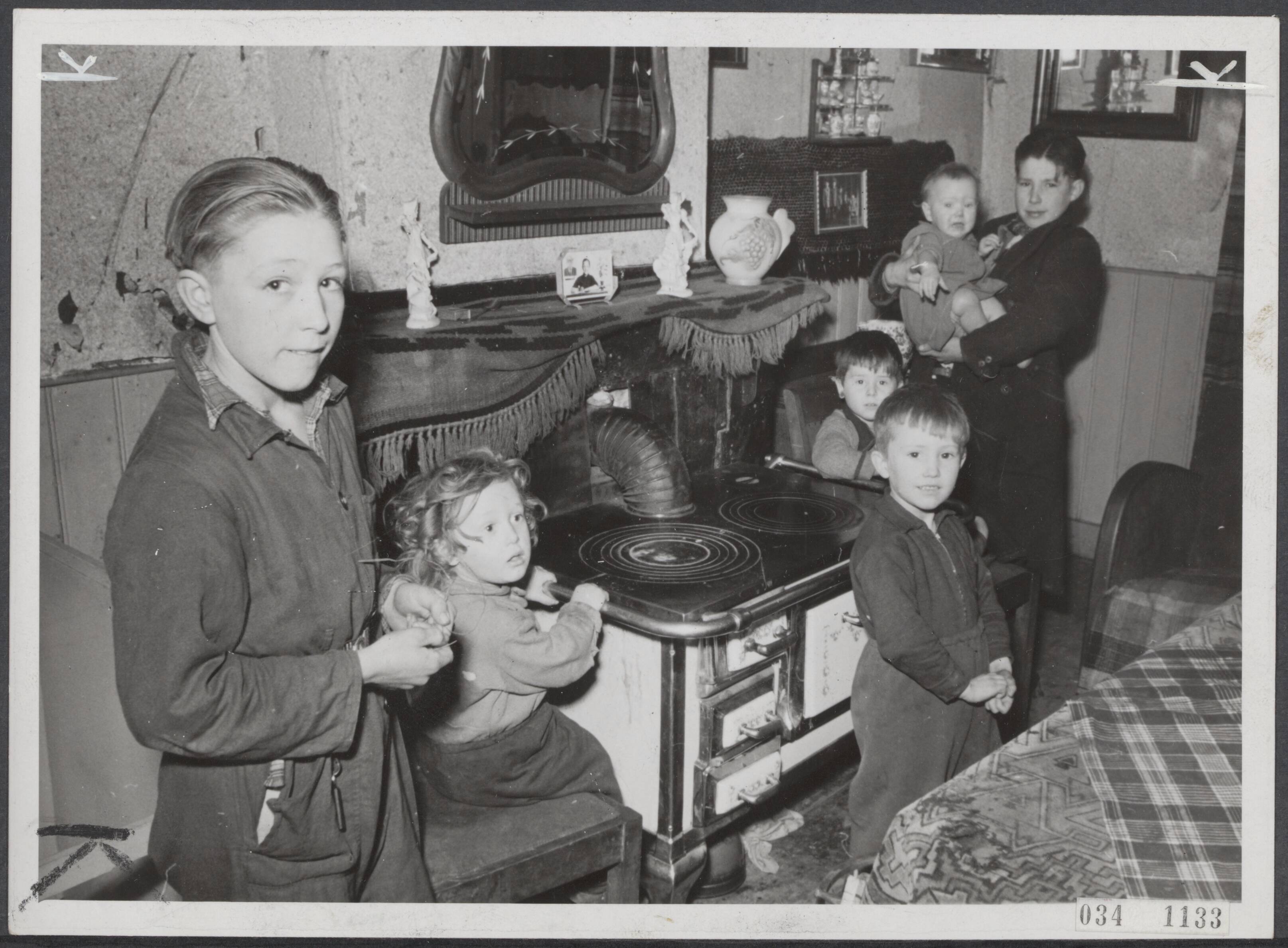 Excursie van het Departement van Volksvoorlichting en Kunsten naar de stegen en sloppen van Den Haag om daar de noodtoestanden in ogenschouw te nemen en aantekeningen te maken waar hulp dringend noodzakelijk is. Bij deze foto: Misstanden heersen in deze gezinnen. Moeder gaat de gehele dag uit werken en om 10 uur 's-ochtends lopen de kinderen nog met een lege maag rond