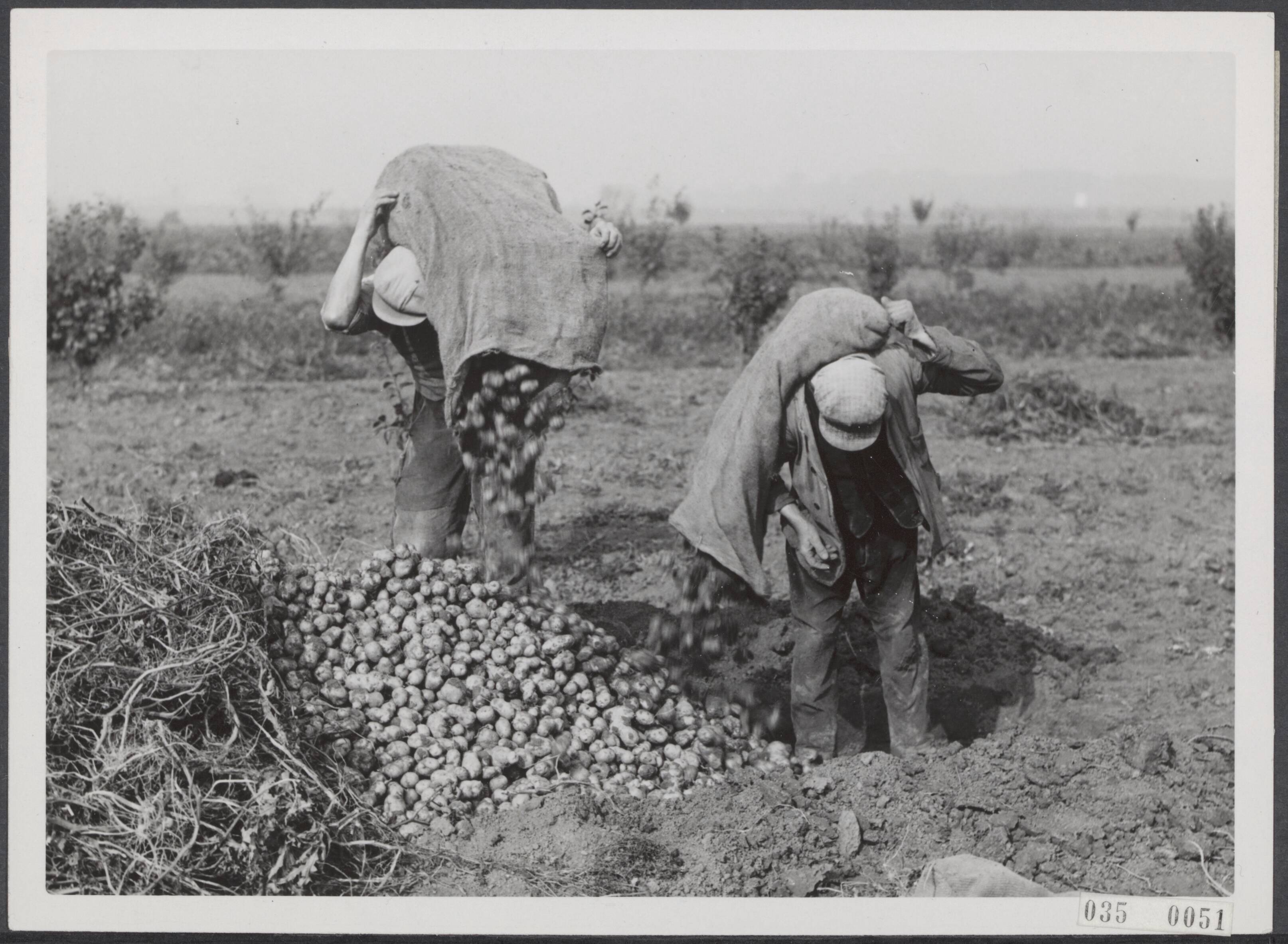 Productieslag 1941: Winteraardappeloogst in de Betuwe in volle gang. Tegen het vallen van de avond, als de dagtaak ten einde is, dan nemen de rapers en rooiers de volle zakken op hun ruggen en gieten ze de aardappels uit in de op akkers gemaakte kuilen. Deze kuilen worden, als al de aardappels gerooid zijn, netjes dichtgemaakt, totdat de aardappels op weg moeten naar de consument