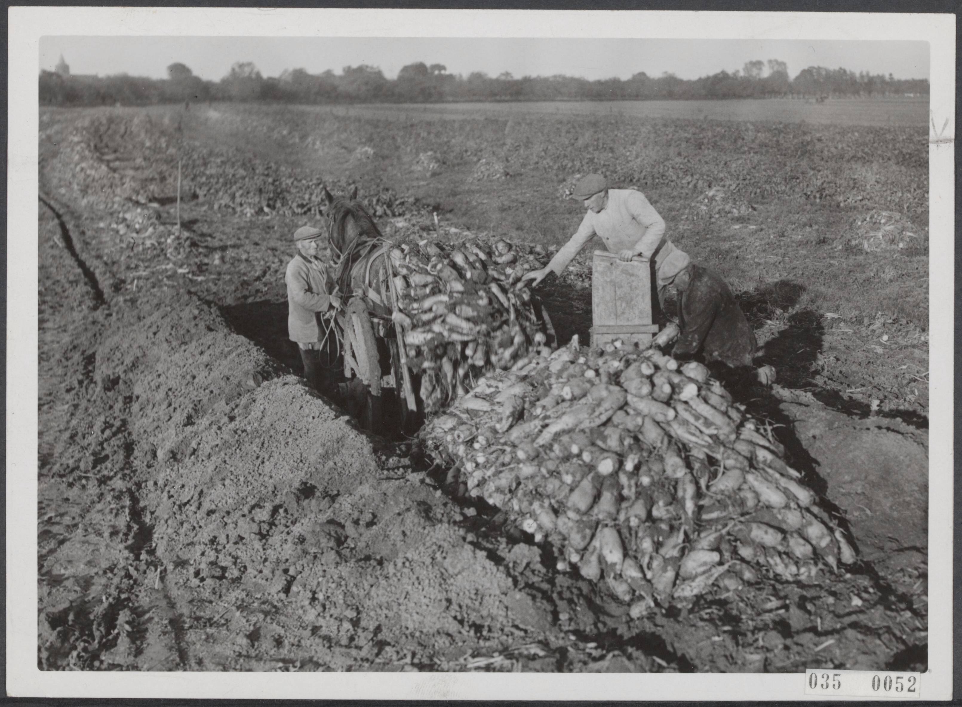 Productieslag 1941: Het kuilen van voederbieten. Op de Betuwse akkers maakt men grote kuilen om de voederbieten in te kuilen. Zo u ziet rijdt men met paard en kar de kuilen in en stort men de bieten, die netjes gevlijd worden om in de winter voor veevoeder te dienen
