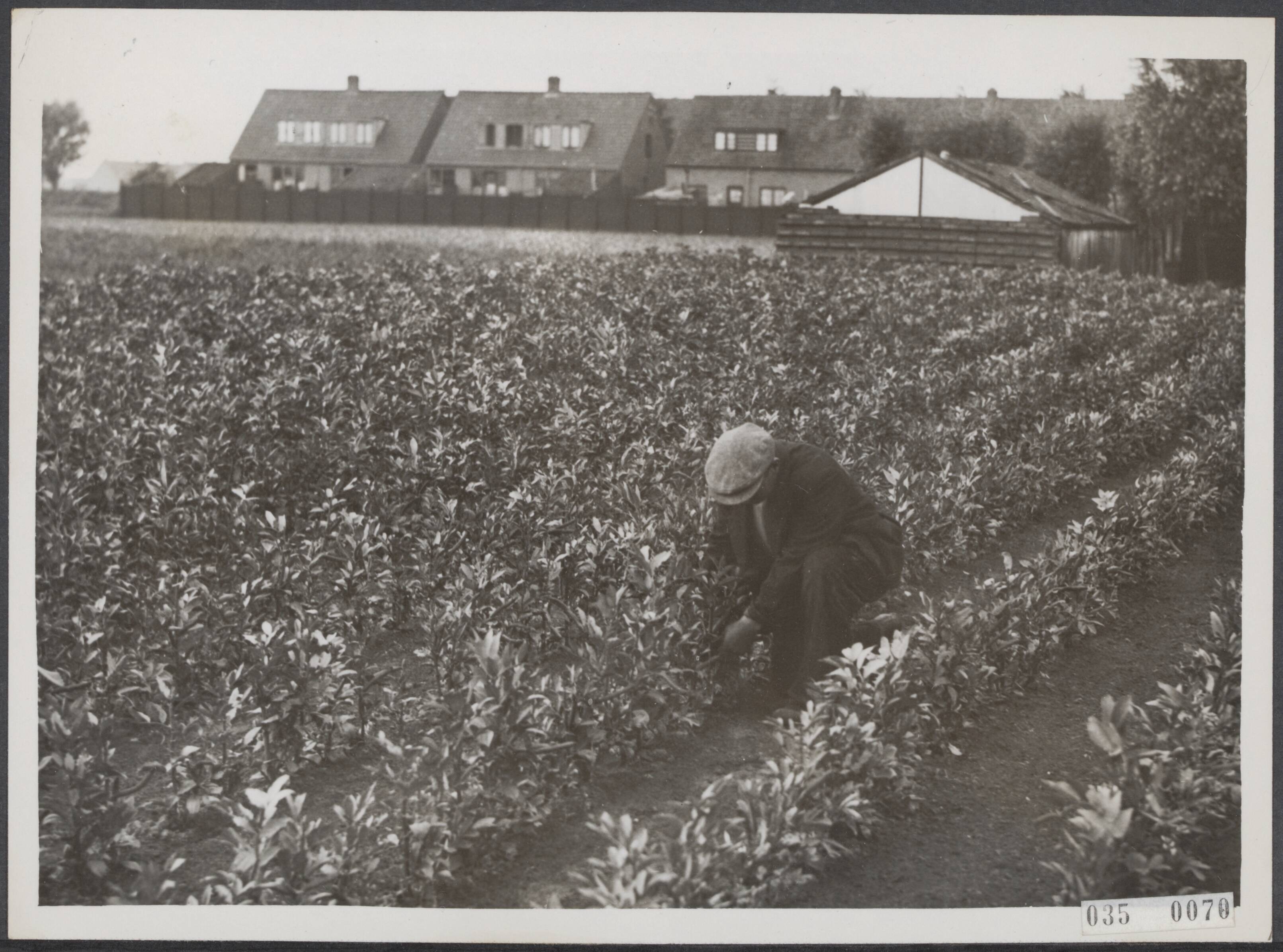 Bijschrift "De helft van het bloembollenland is productief gemaakt voor het verbouwen van velerlei soorten voedingsgewas. Niet minder dan 3500 bunder is darvoor intensief bewerkt en de resultaten overtreffen alle verwachtingen. De tuinbonen staan er best voor"