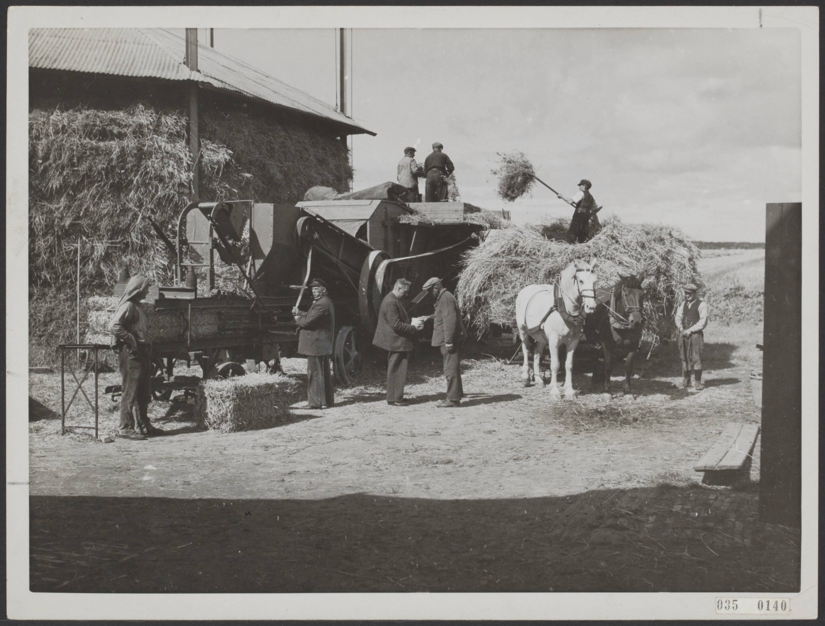 In de Haarlemmermeer is men druk bezig met het dorsen van de graanoogst. Overzicht bij een van de dorsmachines