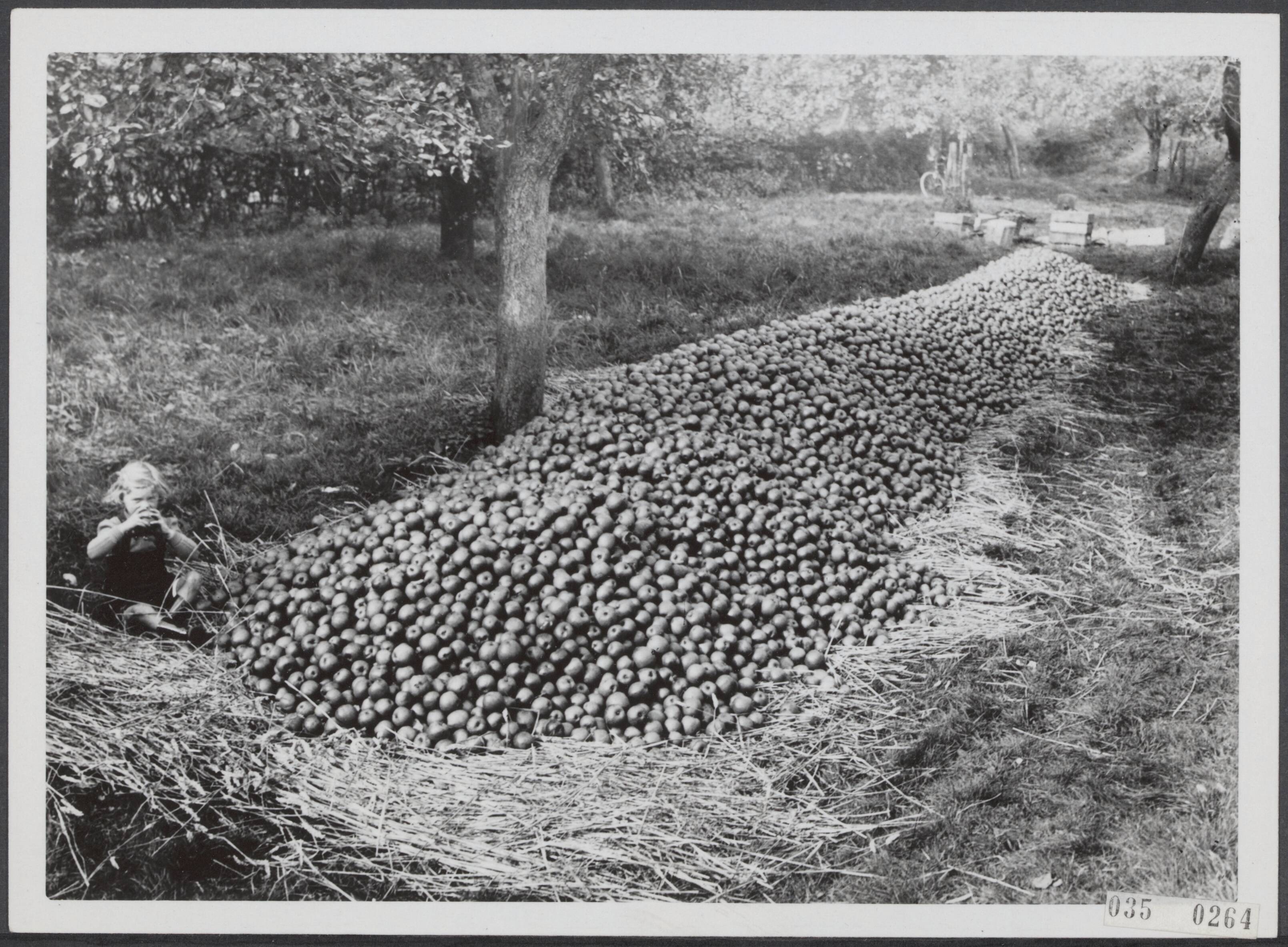De appelpluk in de Betuwe. Niet al de appels worden geplukt en direct in kisten naar de veiling gebracht, want de beroemde ster-appels, worden nadat ze geplukt zijn, een dag of 8 op een grote hoop in de bongerd onder de bomen gelegd. Want van het liggen krijgen de ster-appels de mooie rode kleur