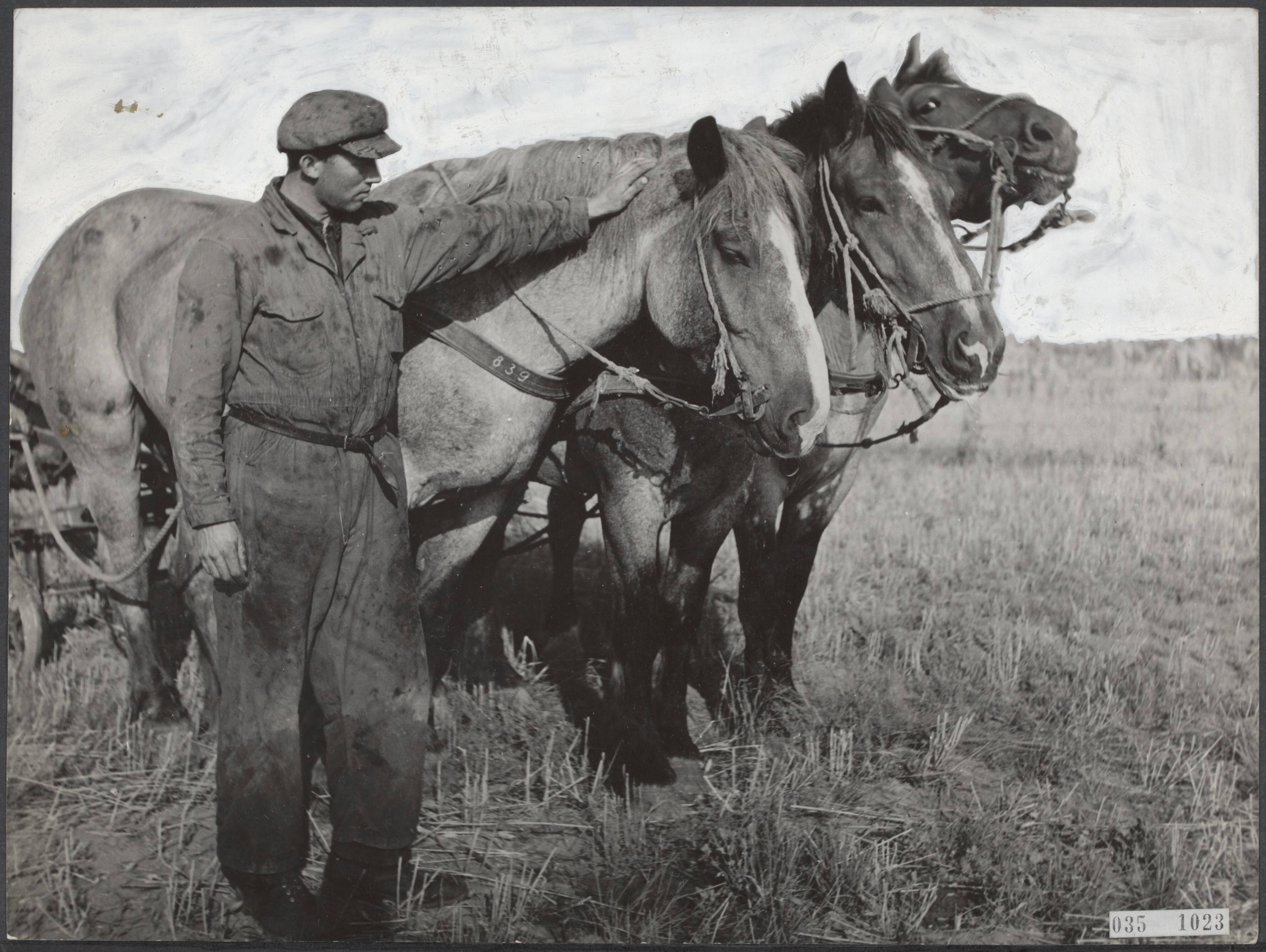Vrijwilligers helpen de boeren in de Noordoostpolder Man in overall bij een span van drie trekpaarden