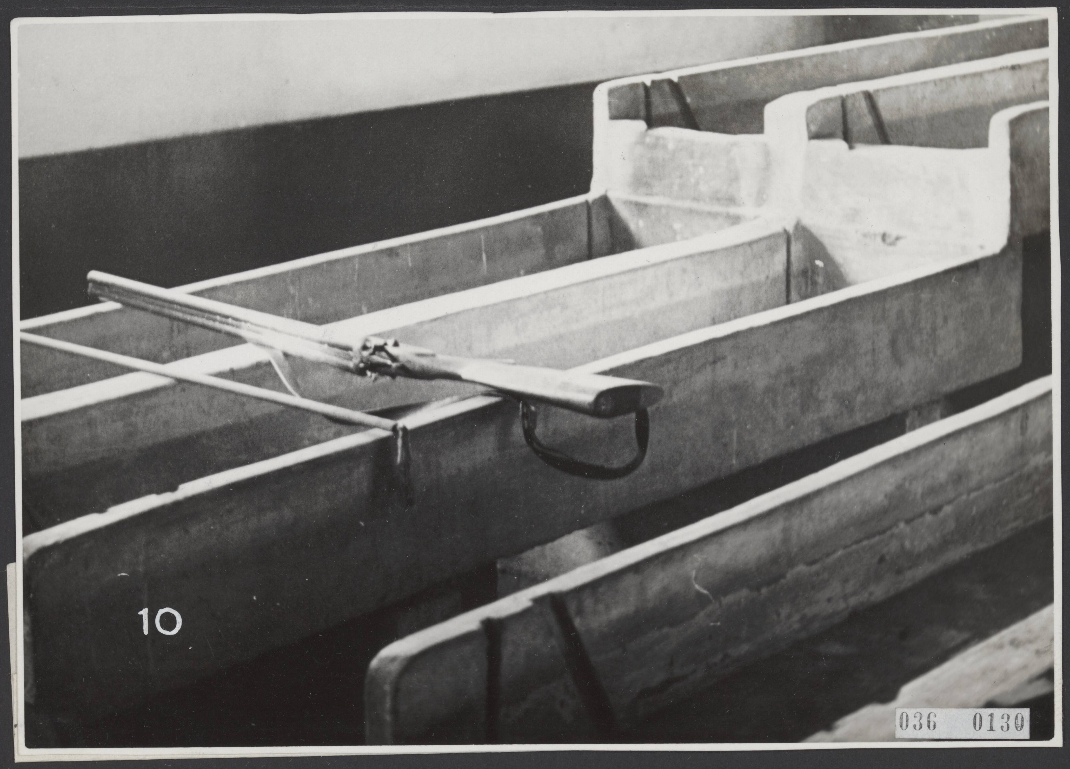 10. Enkele der kweekbakken in het kweekhuis. Hierheen worden de eieren gebracht, om er hun eerst ontwikkeling door te maken. Het dubbelloops jachtgeweer wijst erop dat soms ongewenste gasten, zoals reigers, een bezoek aan de kweekvijvers brengen