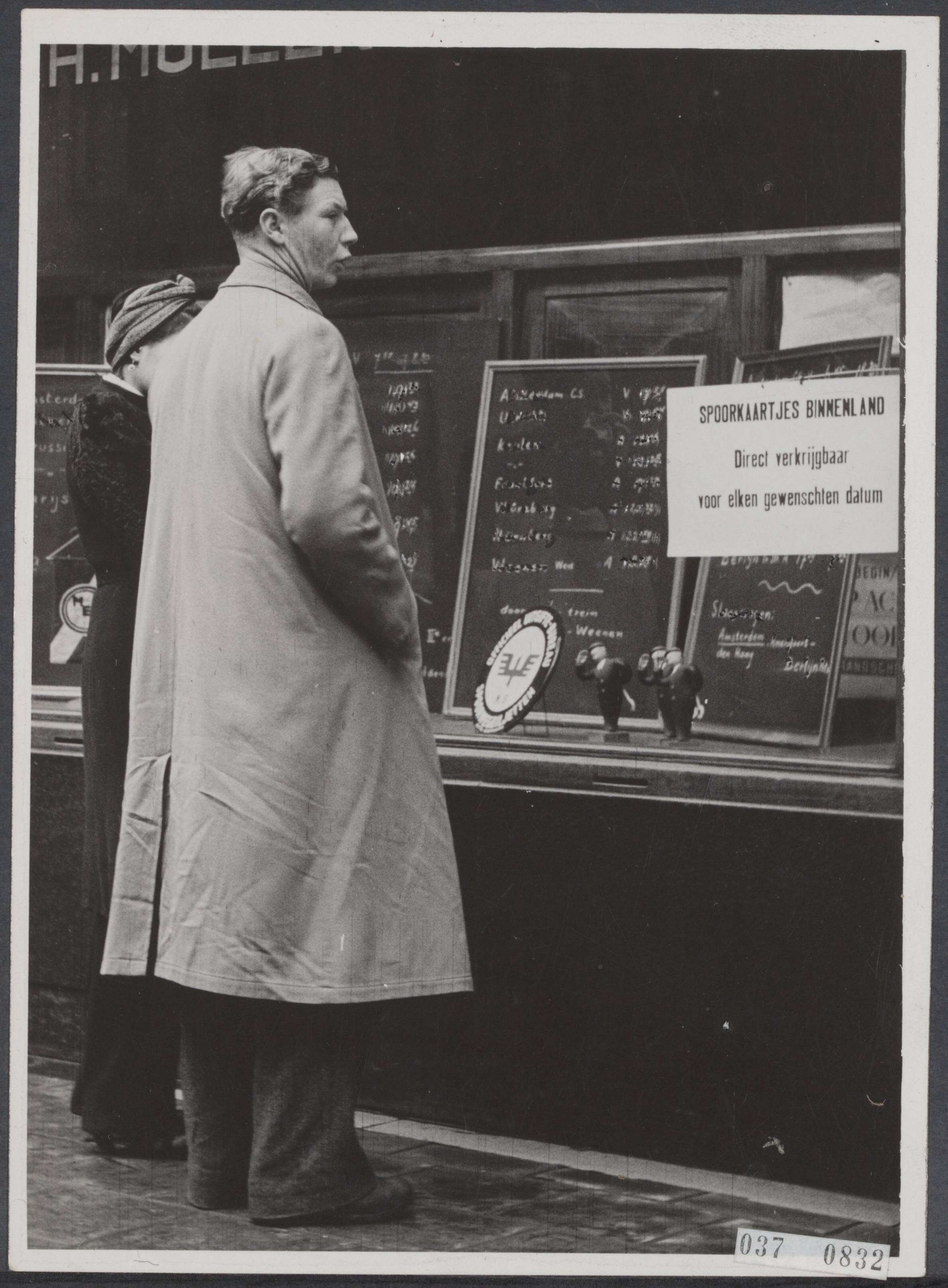 Man voor etalageruit van reisbureau op het Damrak te Amsterdam. Op de ruit "Spoorkaartjes binnenland. Direct verkrijgbaar voor elken gewenschten datum". Foto uit serie. Opschrift achterzijde foto "12. Zie elk moment iets nieuw en elk moment iets typisch, flisten van 't leven"