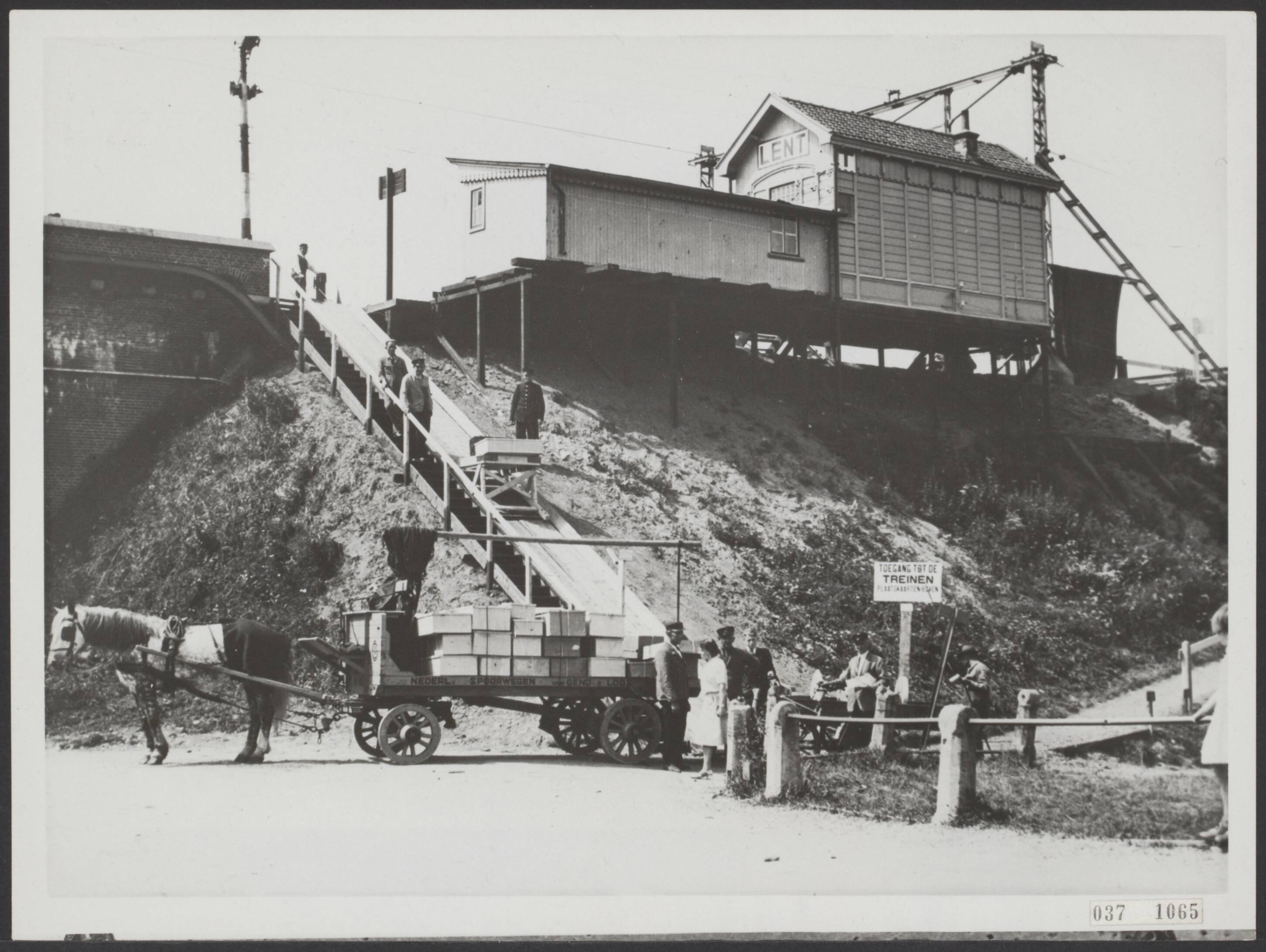 Door de omstandigheden beleeft het stationnetje Lent bij Nijmegen een belangrijke opleving. Er heeft ook een uitgebreid goederenverkeer plaats. De foto laat zien welk een ingenieuze wijze de N.S. een geimproviseerde "goederenlift' hebben aangebracht, om het aan- en afvoeren van goederen zo snel en gemakkelijk mogelijk over de hoge dijk te doen plaatsvinden