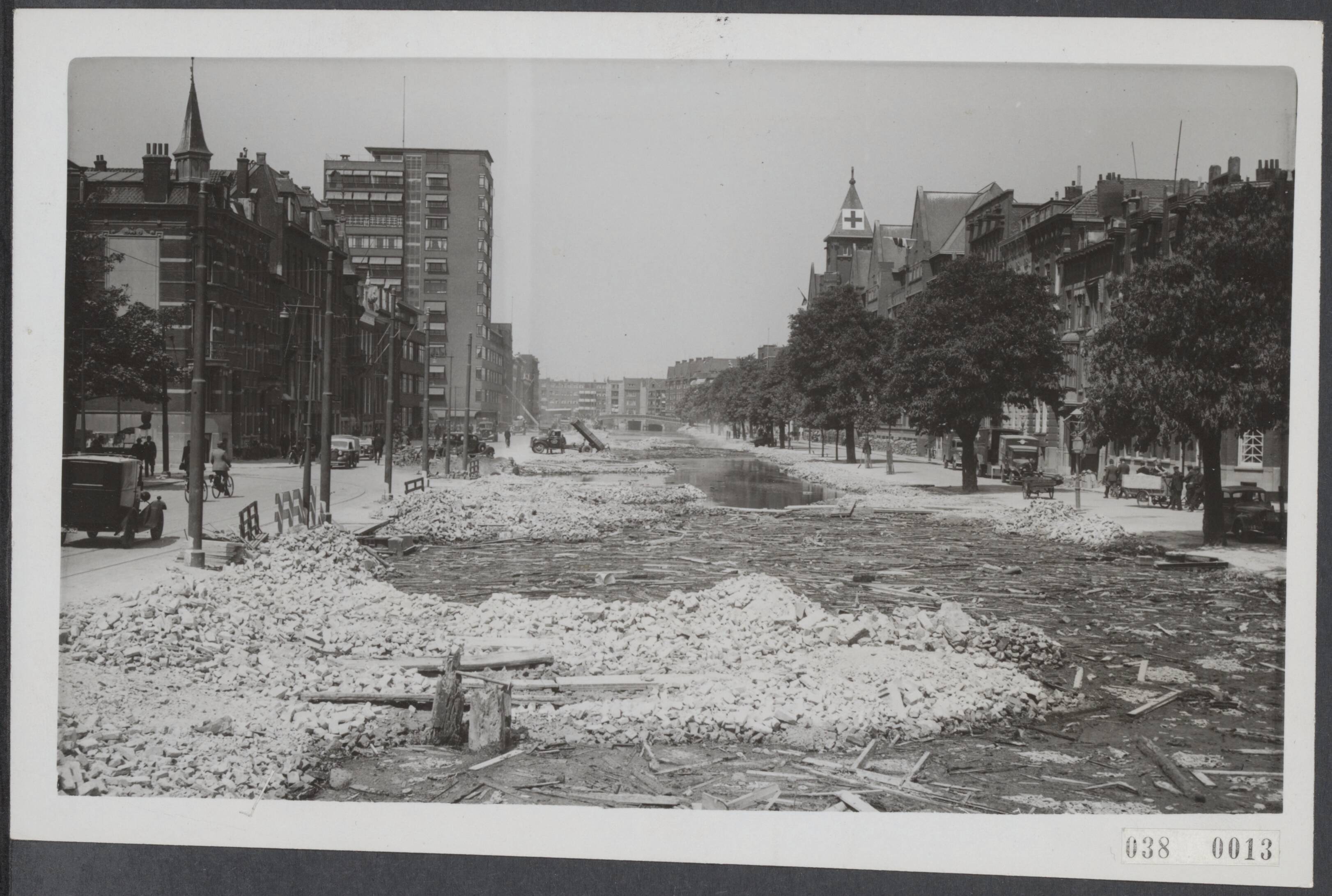 De toekomstige brede boulevard door Rotterdam, die ontstaat als de Schie gedempt is, vordert snel. Men is druk bezig de Schie thans vanaf de Teylingerbrug tot de Heulbrug te dempen. Rechts het grote Sint-Franciscus ziekenhuis, links de Wolkenkrabber