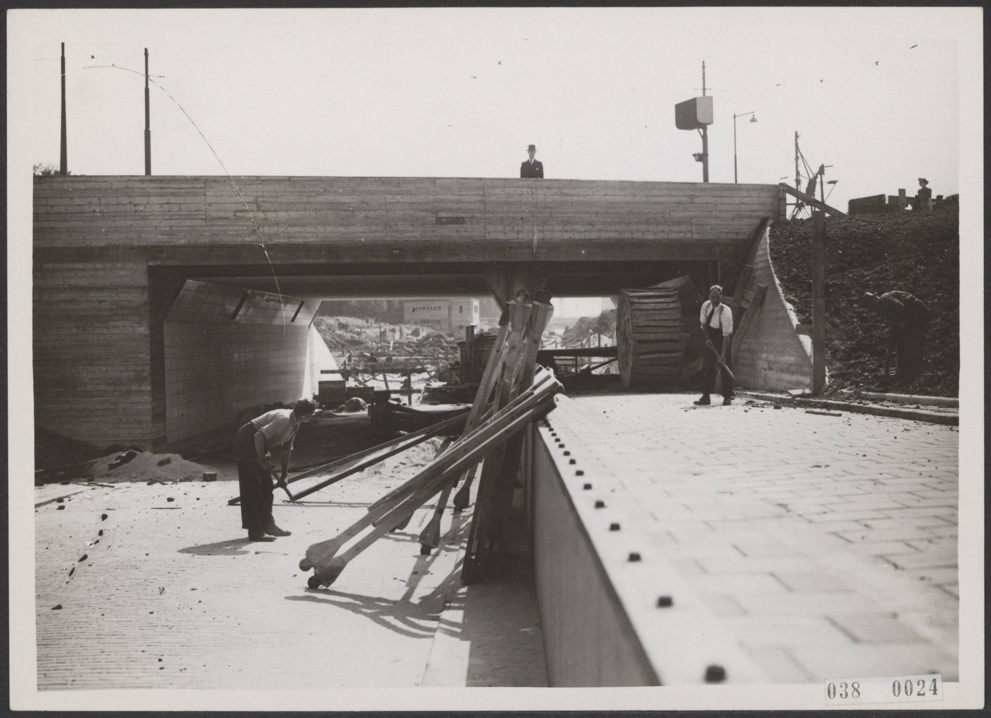 De werkzaamheden aan de Maastunnel te Rotterdam vorderen gestadig. De toegang tot de landtunnel aan de Westzeedijk, welke in verbinding staat met de riviertunnel wordt bestraat
