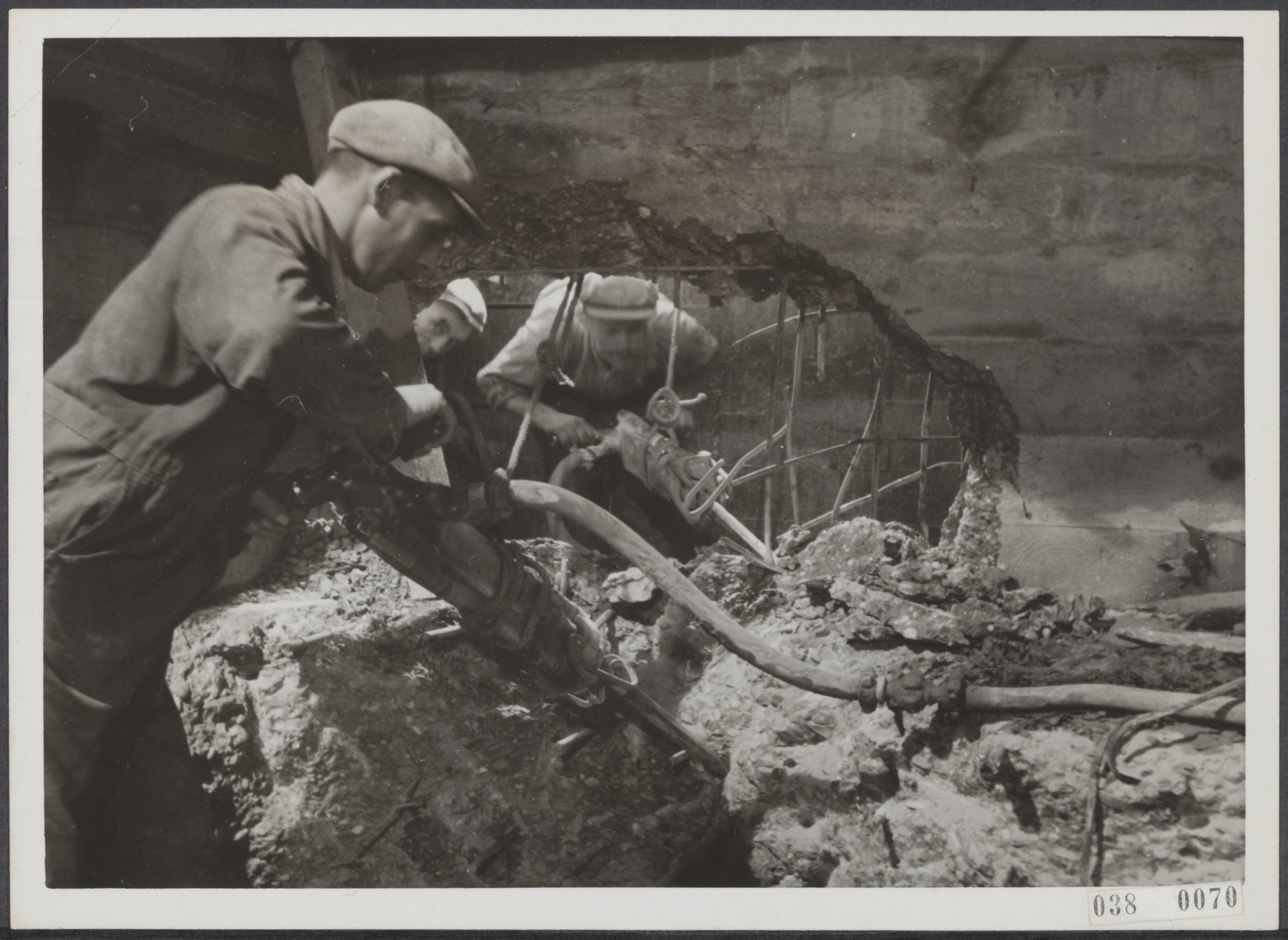 Een historisch ogenblik in de tunnelbouw onder de Maas te Rotterdam. De wand, welke de riviercaisson met het landcaisson verbindt, wordt doorgebroken met behulp van pneumatische boren